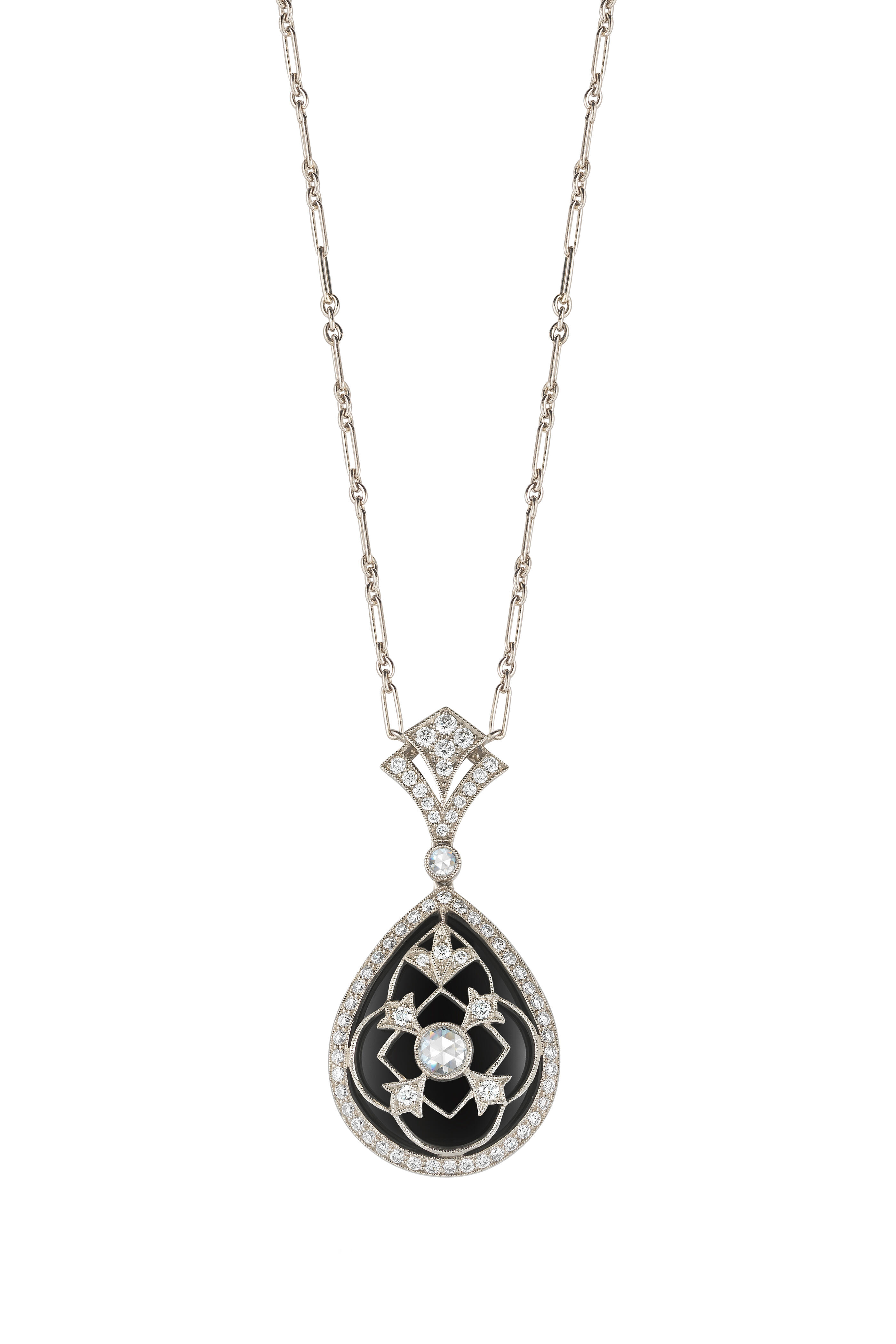 From the Vintage collection. 18k white gold. Black onyx gemstones. 0.64cts color: GH / clarity: VS1-2; (65) round, brilliant-cut & (2) rose-cut white diamonds. Pear shape pendant.