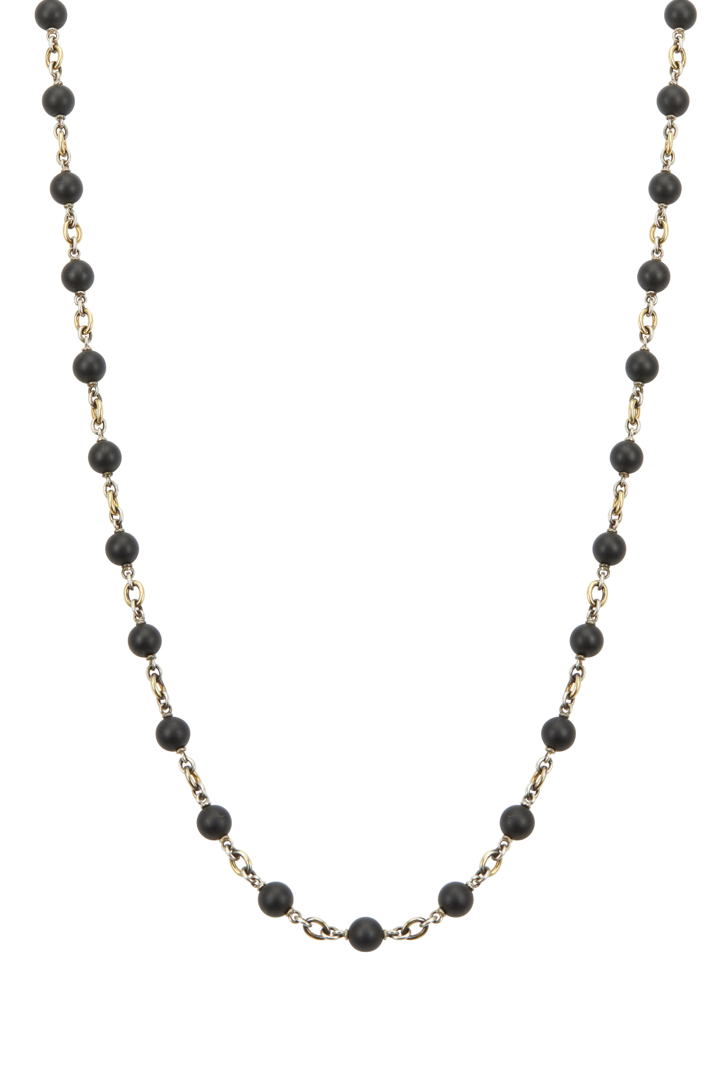 18k yellow gold & sterling silver. 8mm black onyx gemstones. 30" length.