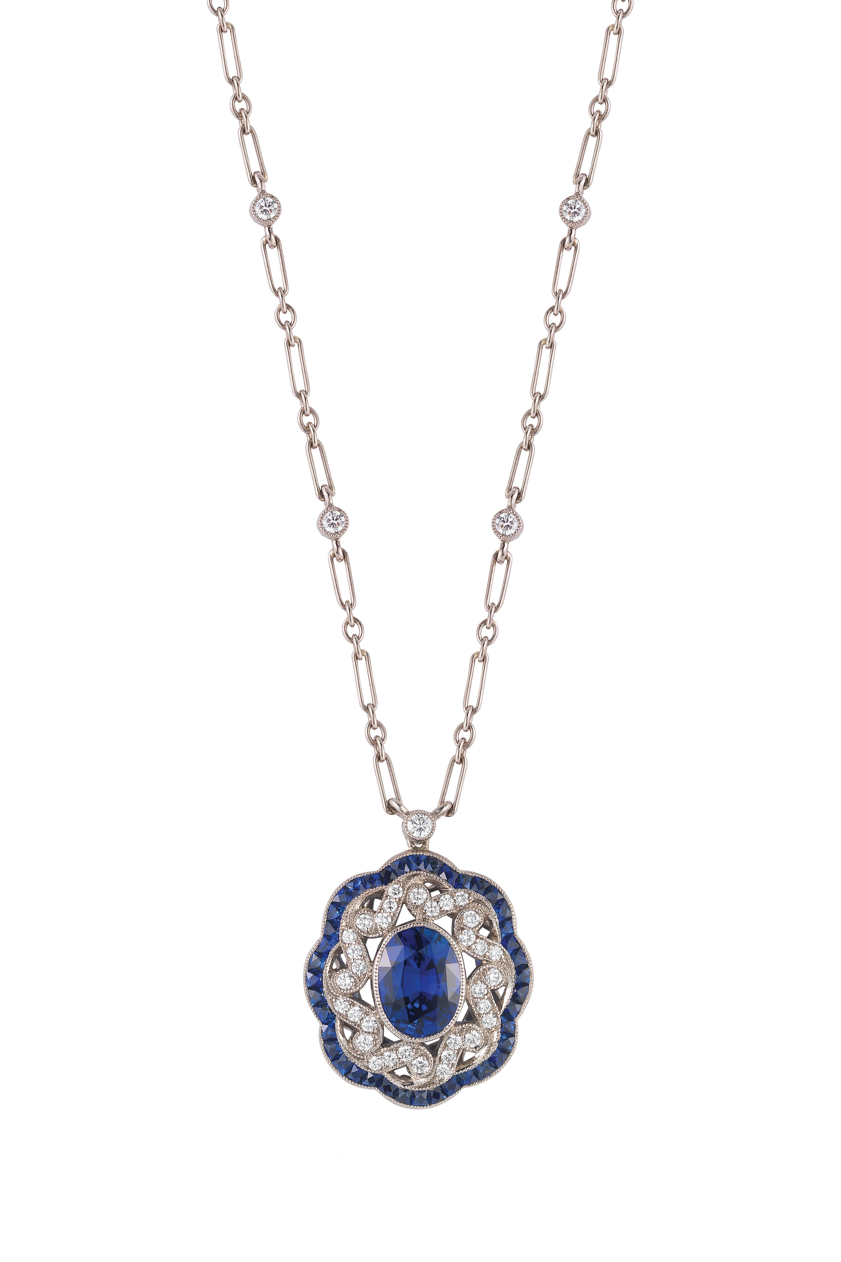From the Vintage collection. 18k white gold. Calliope sapphire gemstones. .35cts color: GH; clarity: VS1-2; (39) round, brilliant-cut white diamonds. 17" length.