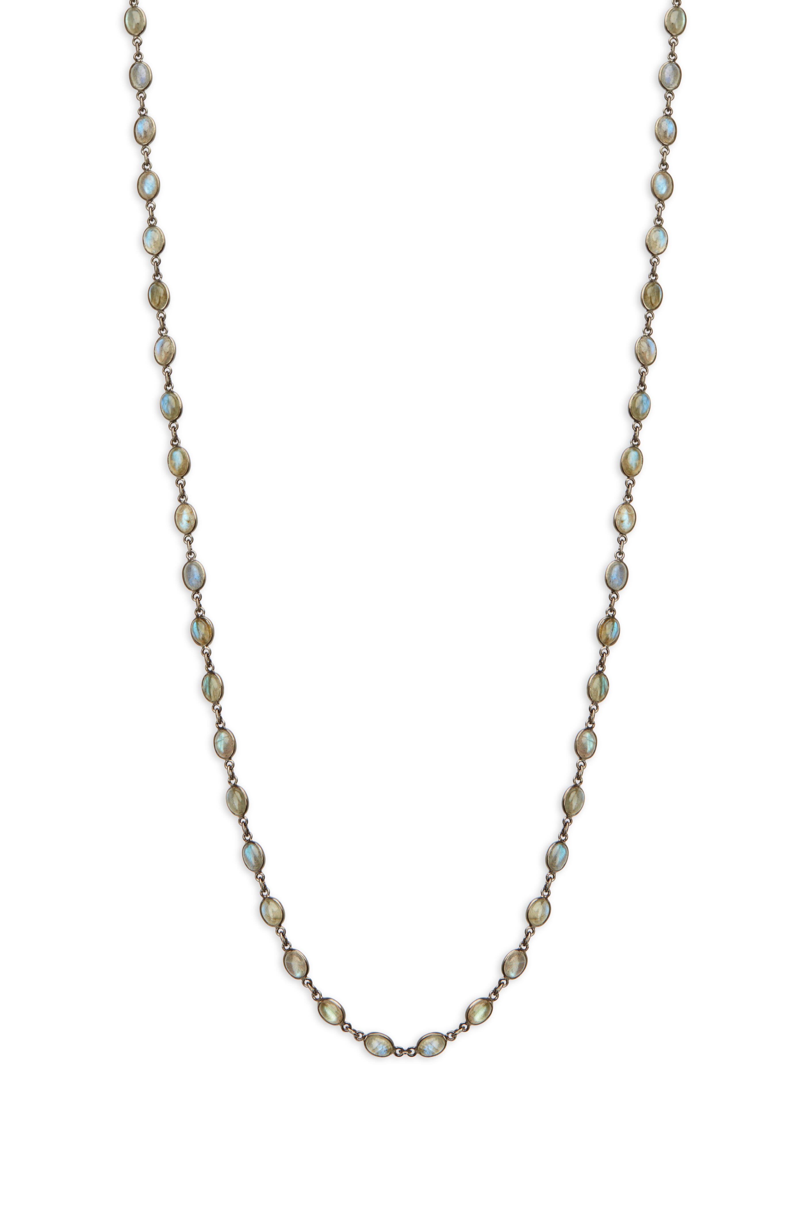 This exceptional sterling silver chain necklace is comprised of alternating small oval labradorite gemstones and shaped links which create a stylish look that is both sophisticated and charming.