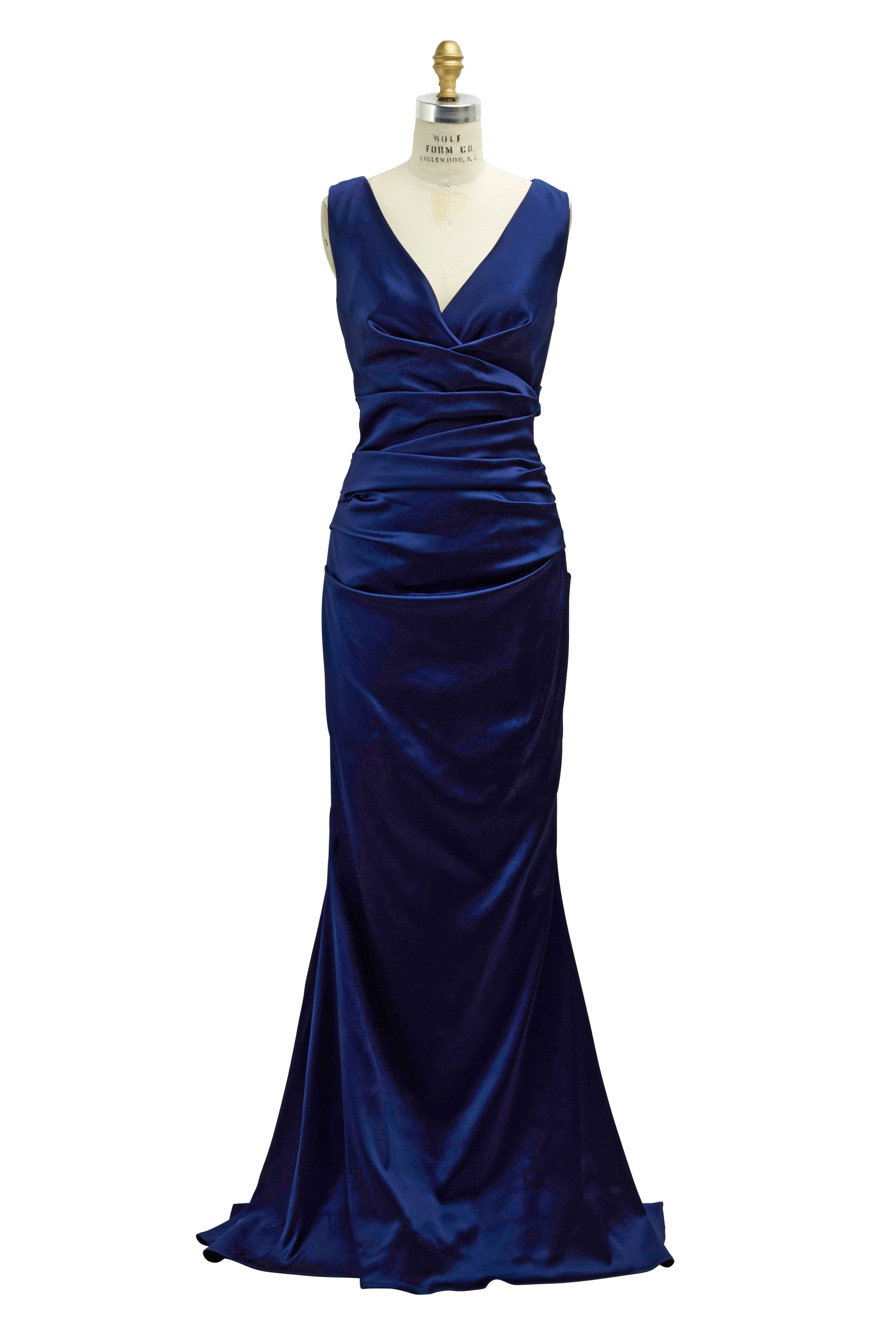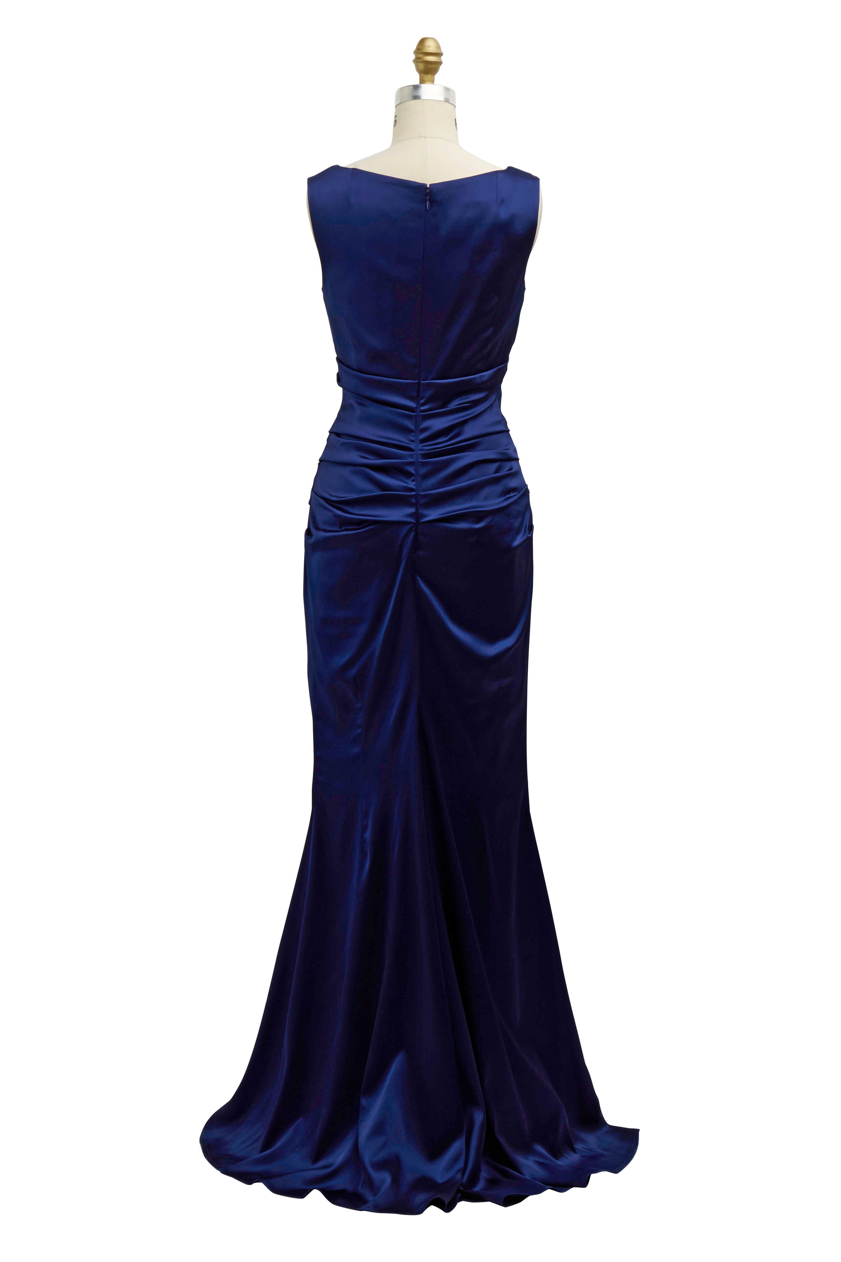 Surplice V neckline, bateau back. Sleeveless. Rouched bodice. Concealed back hook and zip. Slightly flared skirt. 81% acetate, 16% viscose, 3% elastane; fully lined. Dry clean.