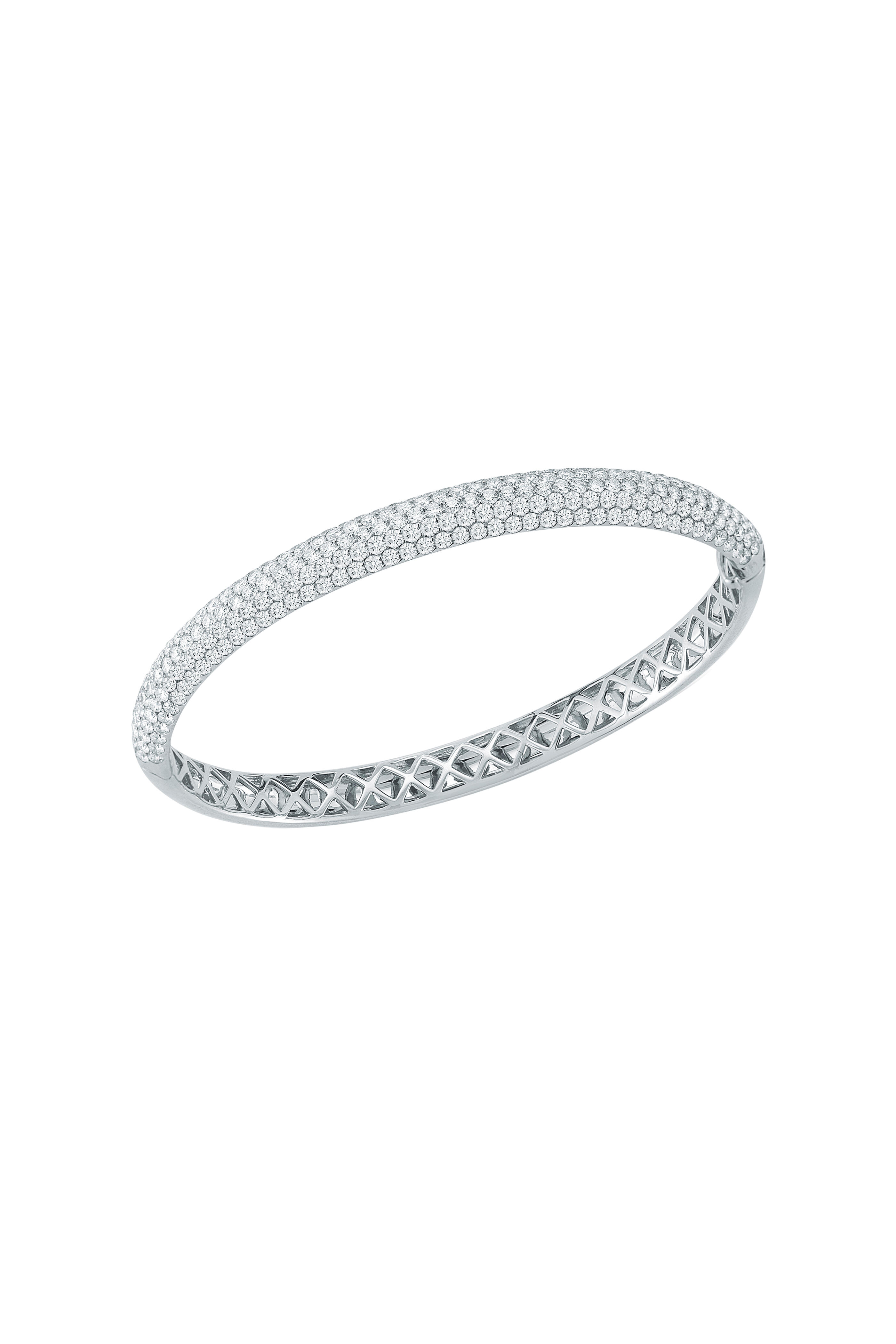 Remarkable elegance created through design; this beautiful bangle features intricate white gold detailing with rows of scintillating diamonds that illuminate the lines of curves of this masterpiece.
