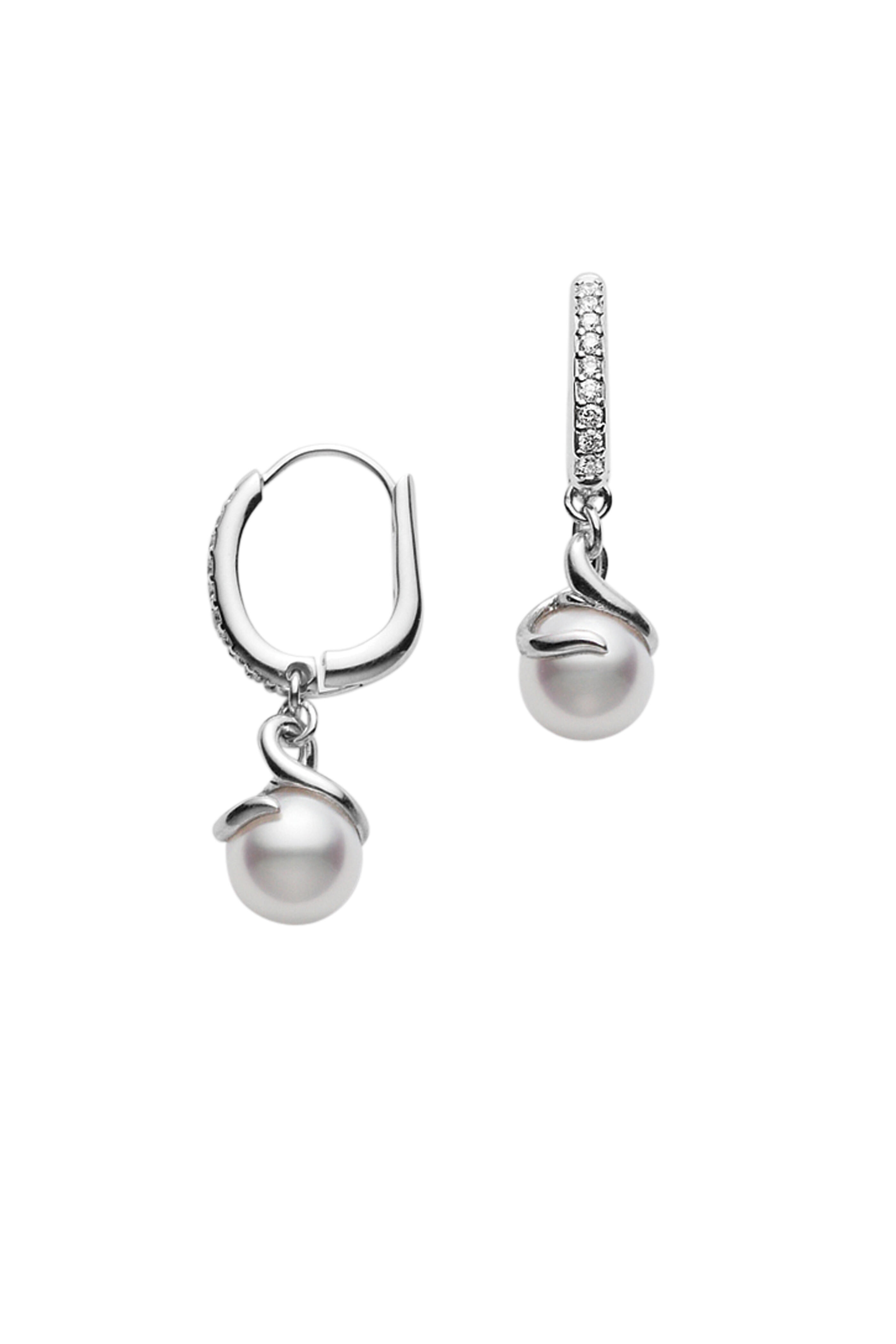 18k white gold. 7mm Akoya A+ white pearls. White diamonds. Leverback.