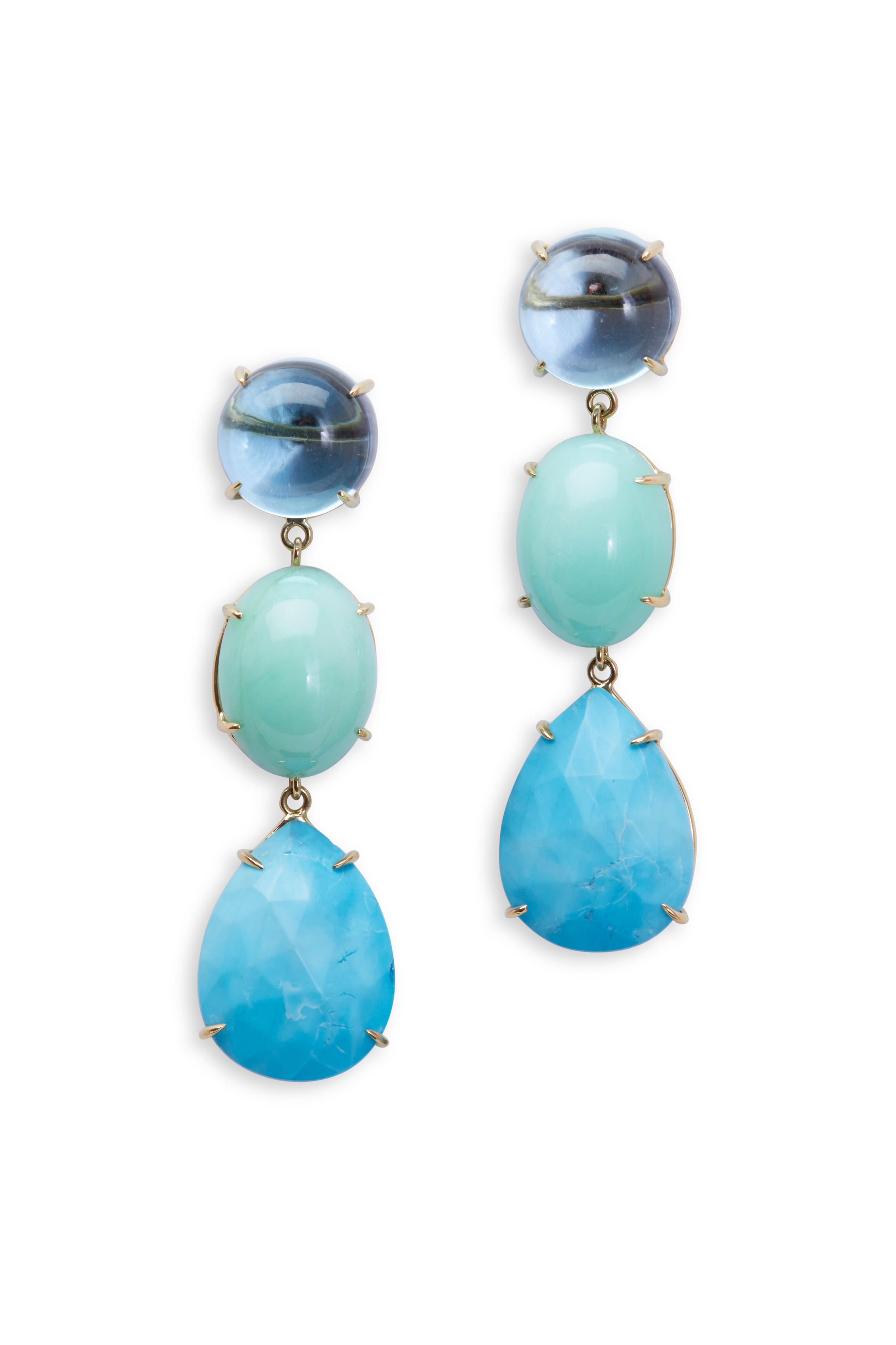 Step into the blue with these sumptuous aquamarine, chrysoprase and turquoise gemstone earrings! Large blue gemstones are framed in polished yellow gold in this wondrous three drop design.