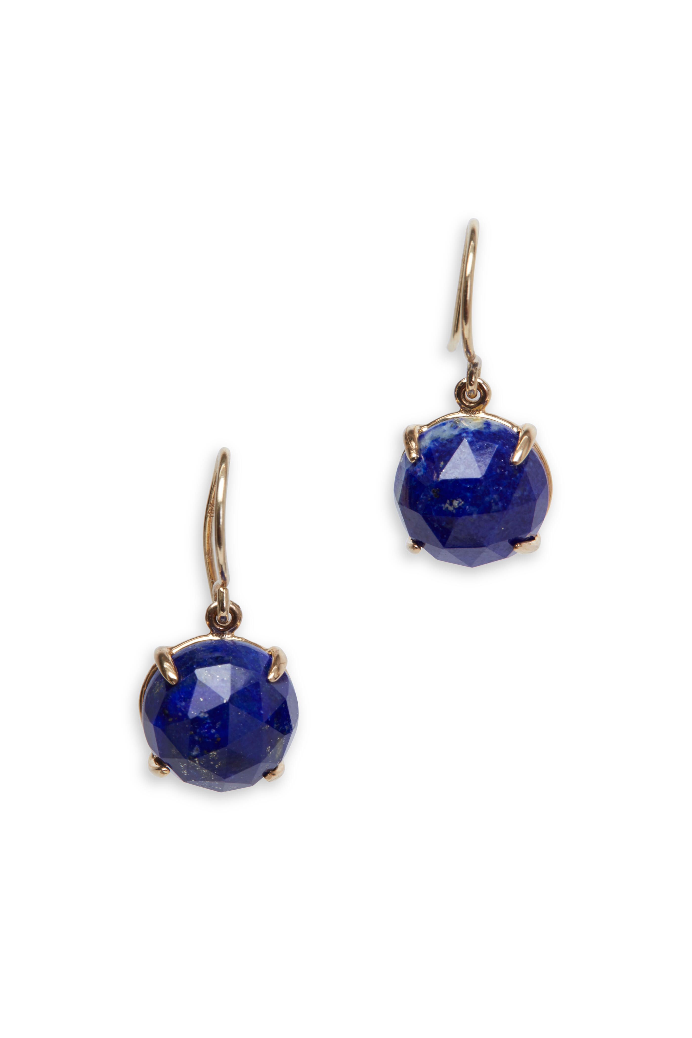 A refreshing burst of blue, these beautiful earrings showcase exquisite, round lapis gemstones of intense dark blue hues that shimmer passionately. They are set in warm yellow gold and secured by four prongs.