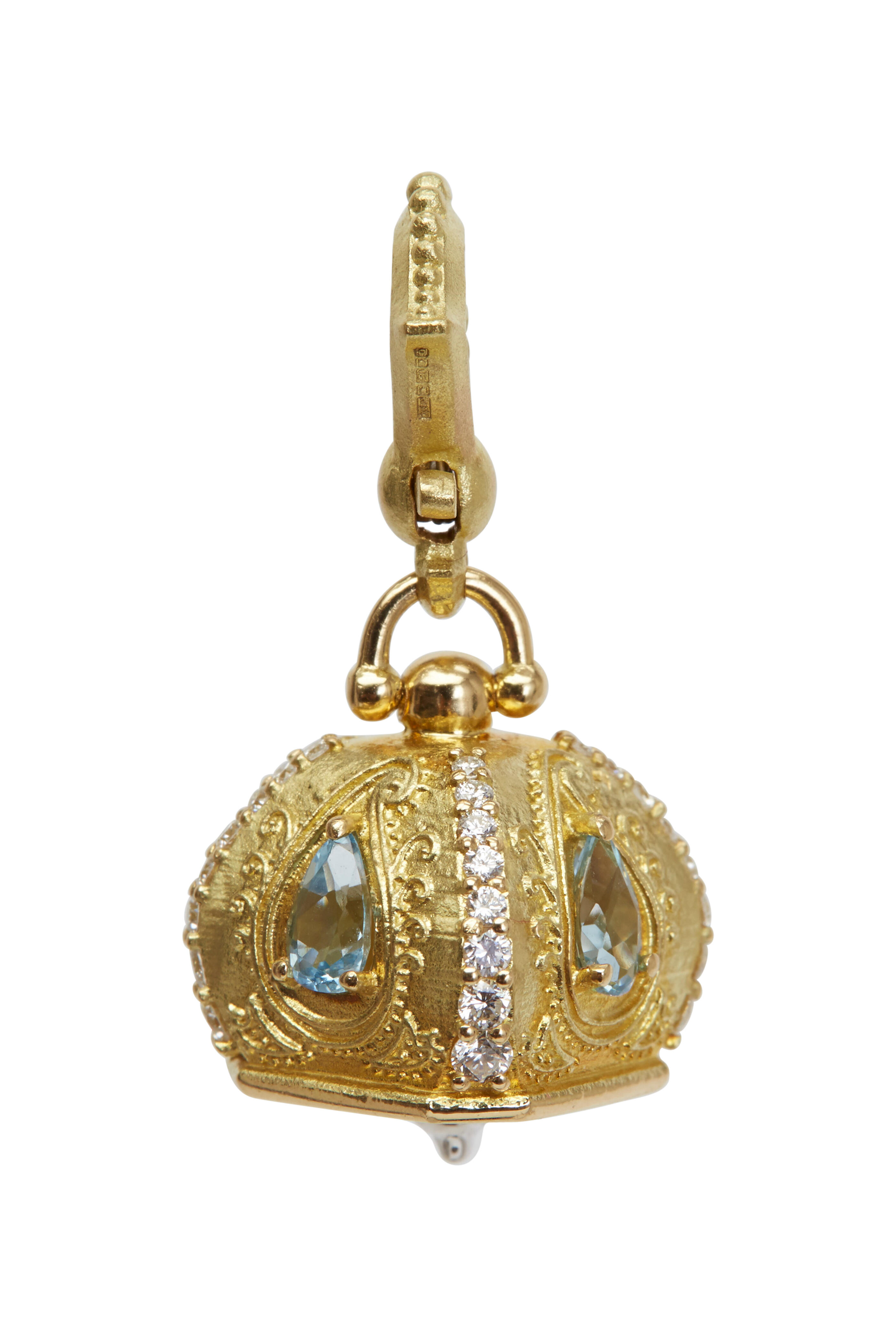 From Paul Morelli's hand made Meditation Bells Collection in 18k gold, each with a clip bale so that you can add to your collection. Clip it on pearls or a favorite necklace. This Meditation bell has detailed granulation work, and aquamarine gemstones and diamonds. Clapper is in white gold.