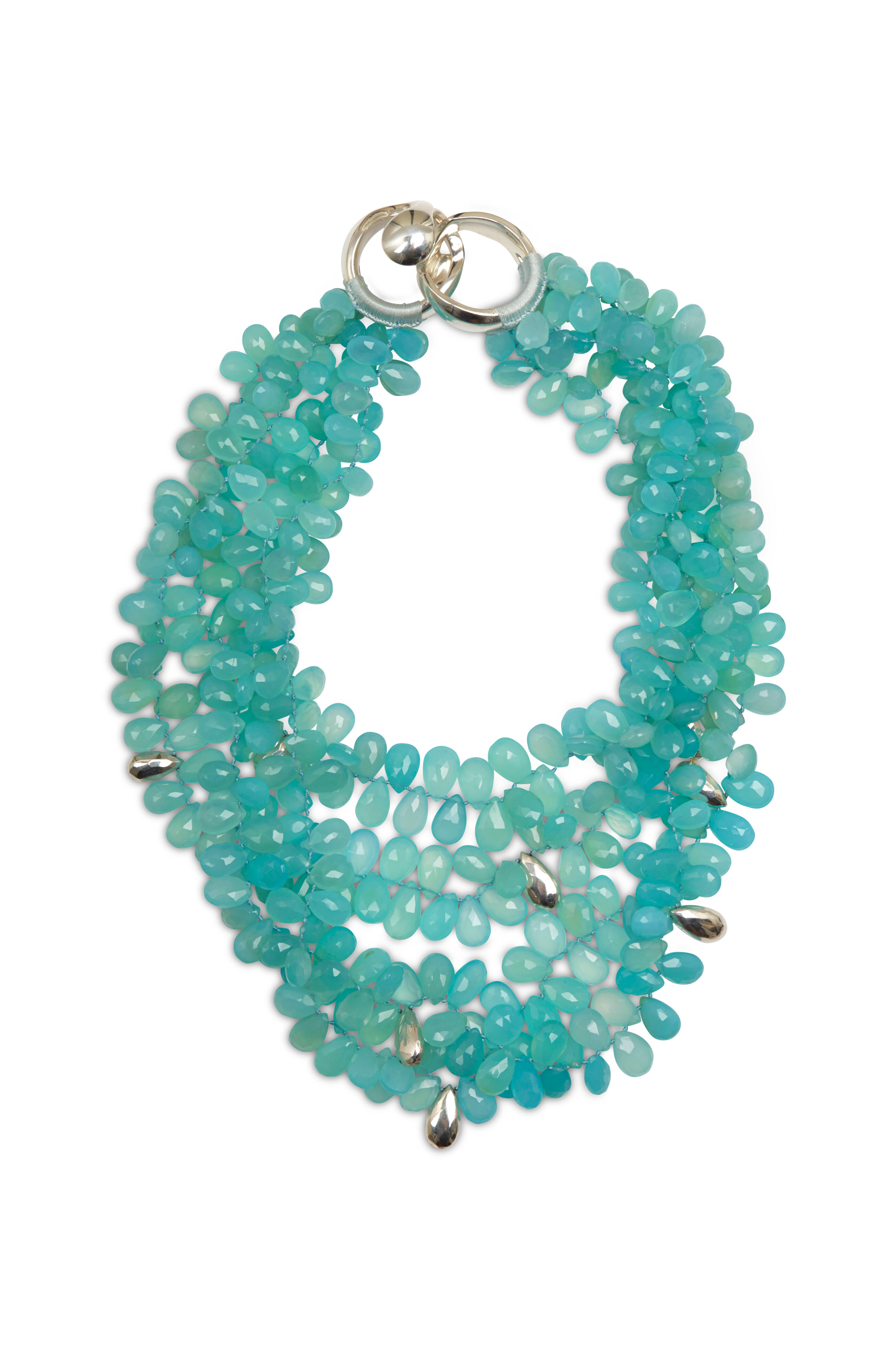 This glamorous aqua chalcedony necklace features four stunning strands of gemstones that shimmer beautifully. Crafted in sterling silver, this necklace is a sumptuous treasure.