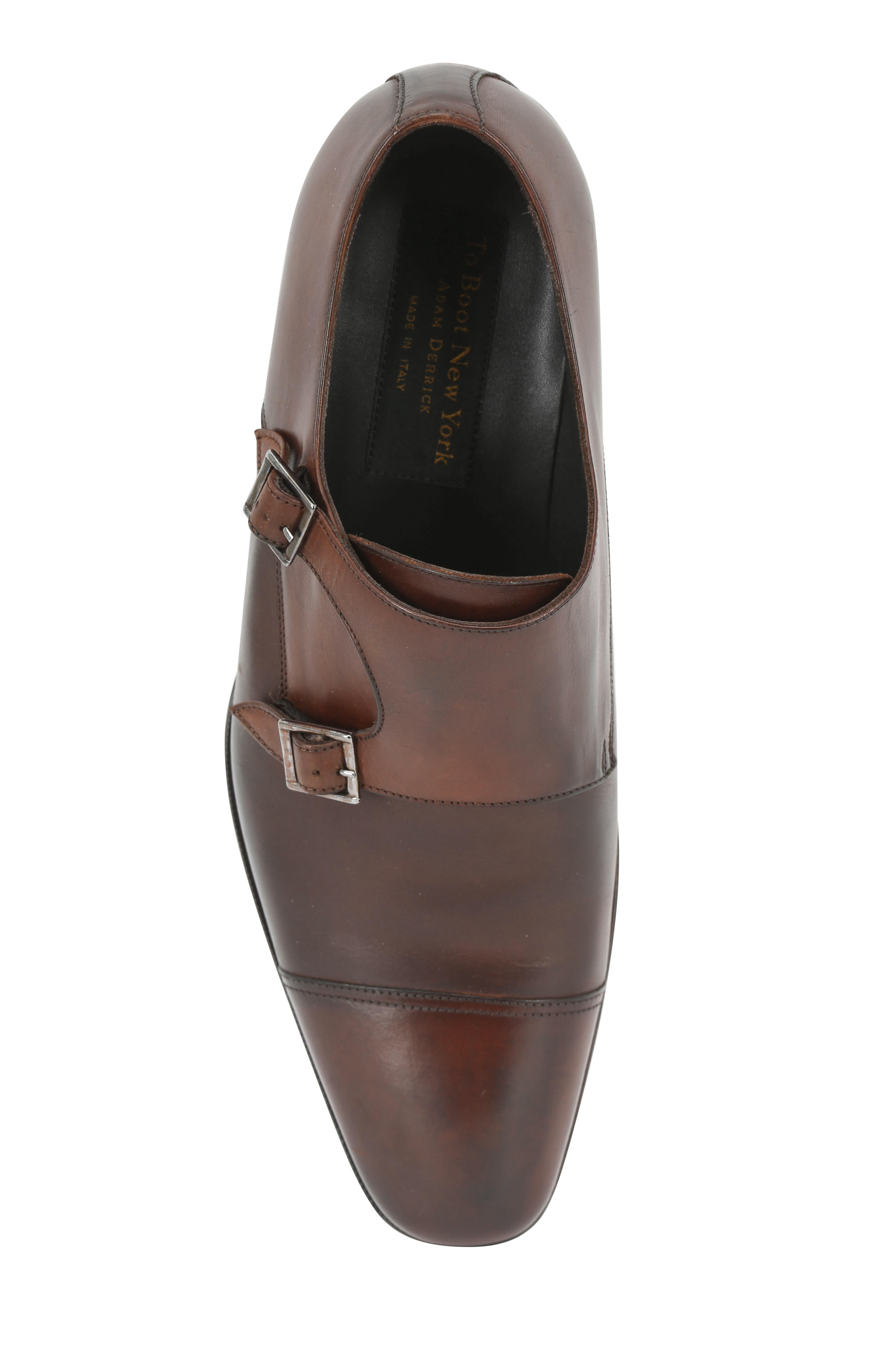 Calfskin leather upper. Square cap-toe. Double monk straps; adjustable buckles. Leather lining and insole. Stacked wooden heel. Leather sole. Made in Italy.