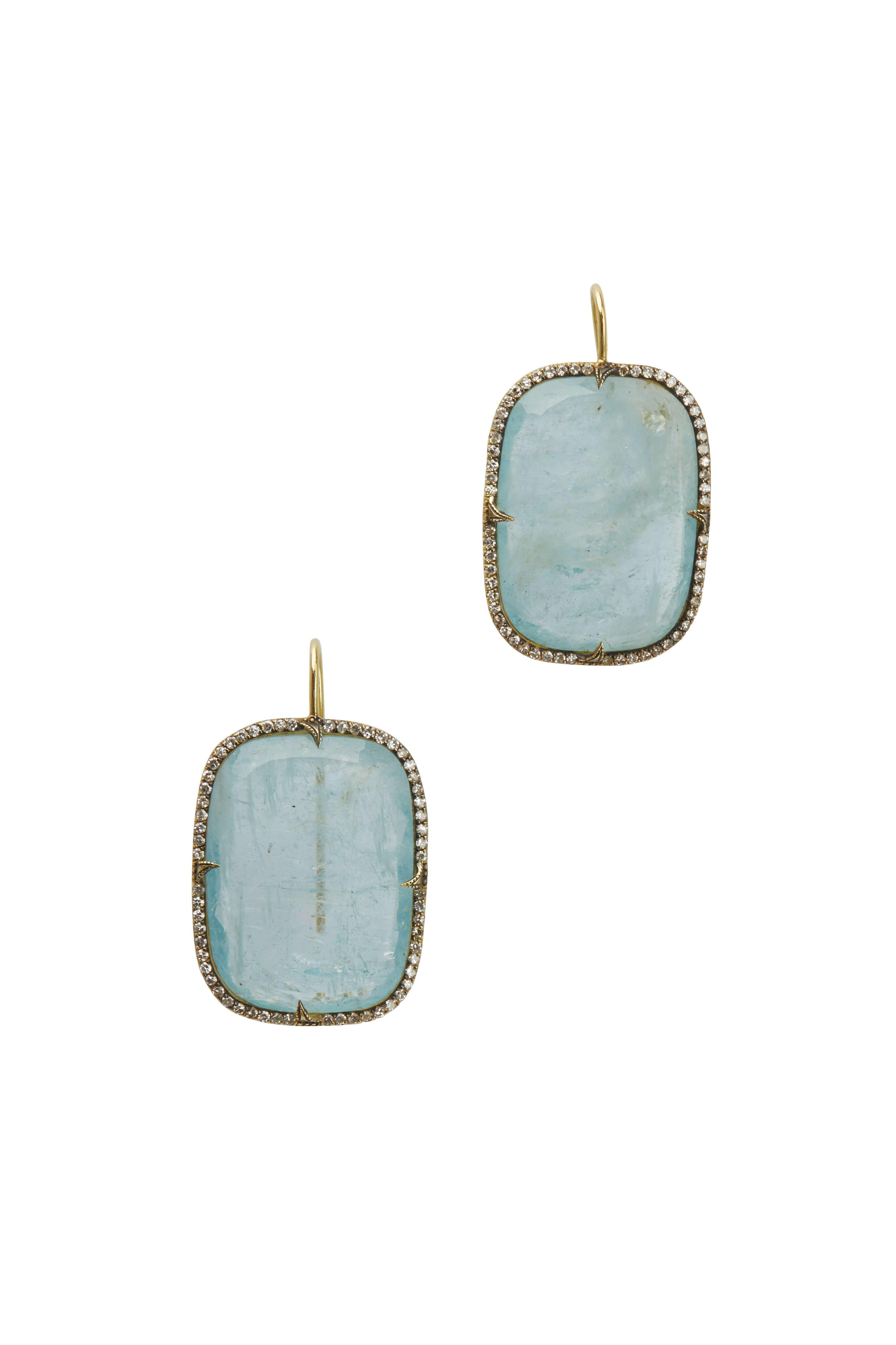 Beautiful light blue hues come to life with these lovely aqua slice gemstones. Surrounded by a sparkling halo of white diamonds, these drop earrings are simply stunning.