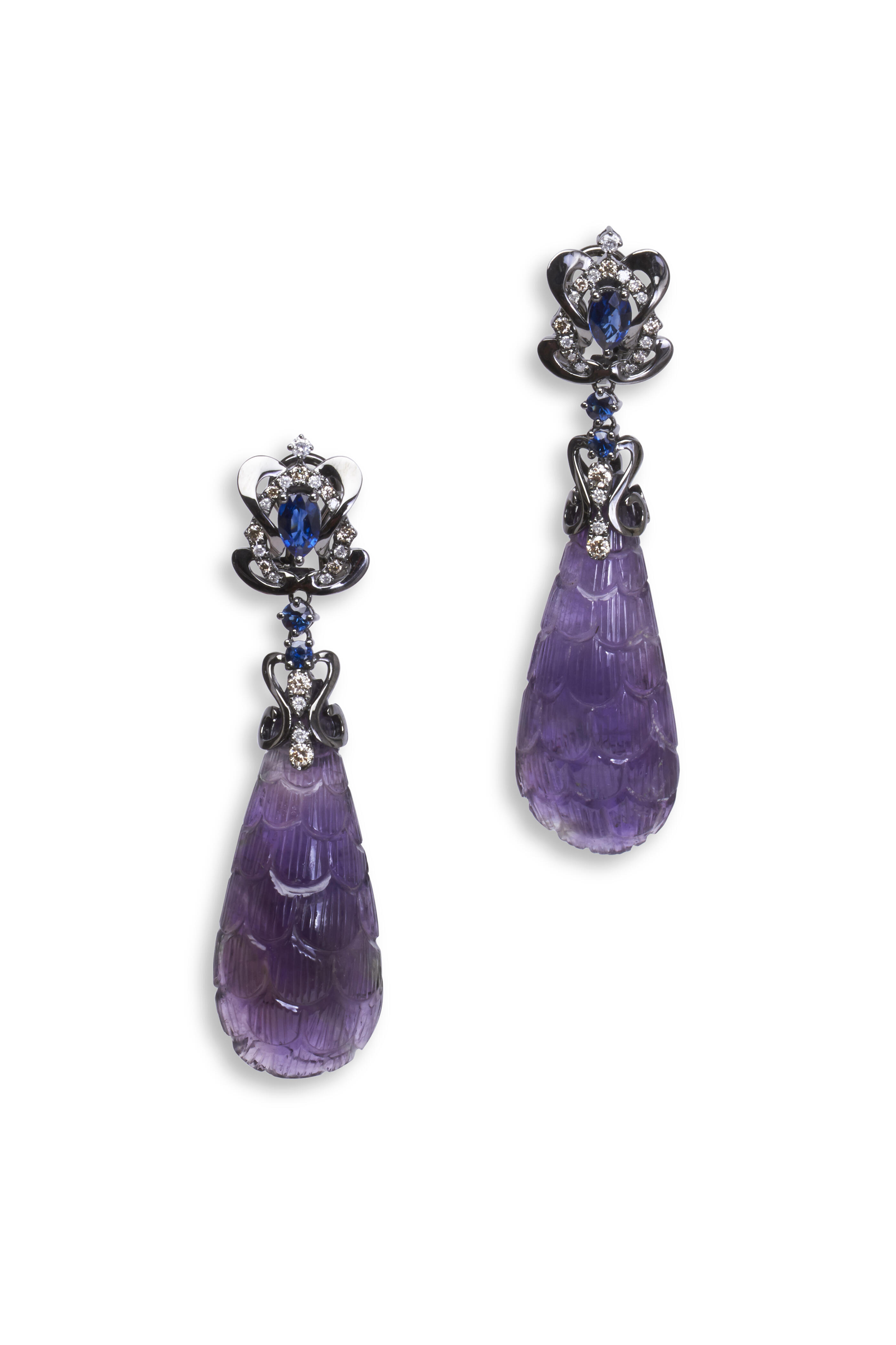 Long and luxe, these amethyst earrings are a great way to add some lovely lavender to your style. Framed in 18k white gold, they feature intricately detailed, frosted amethyst gemstones accented by sparkling white diamonds.