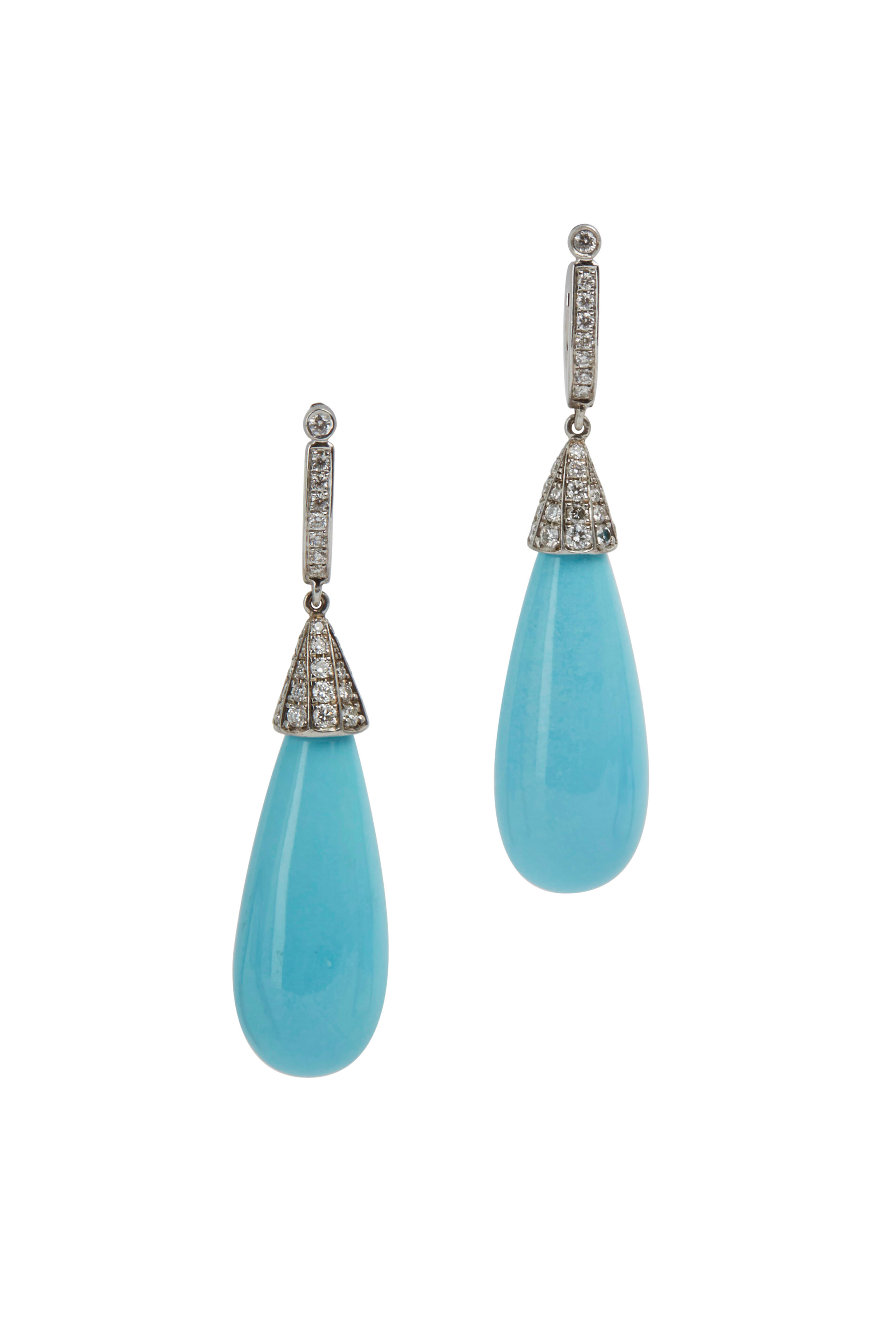 18k white gold. 26mm x 10mm turquoise gemstones. .77cts color: FG; clarity: VS; white diamonds.