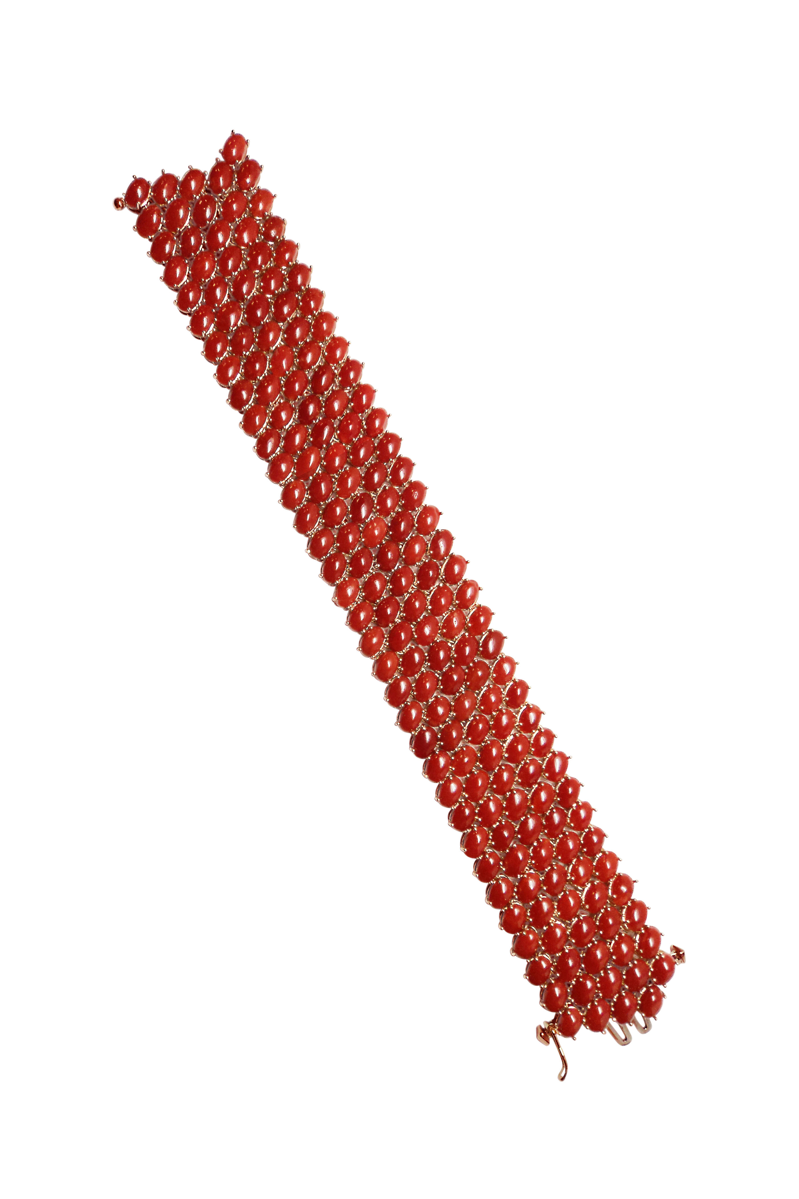 This bold beaded style features five bright rows of red coral set in polished rose gold.