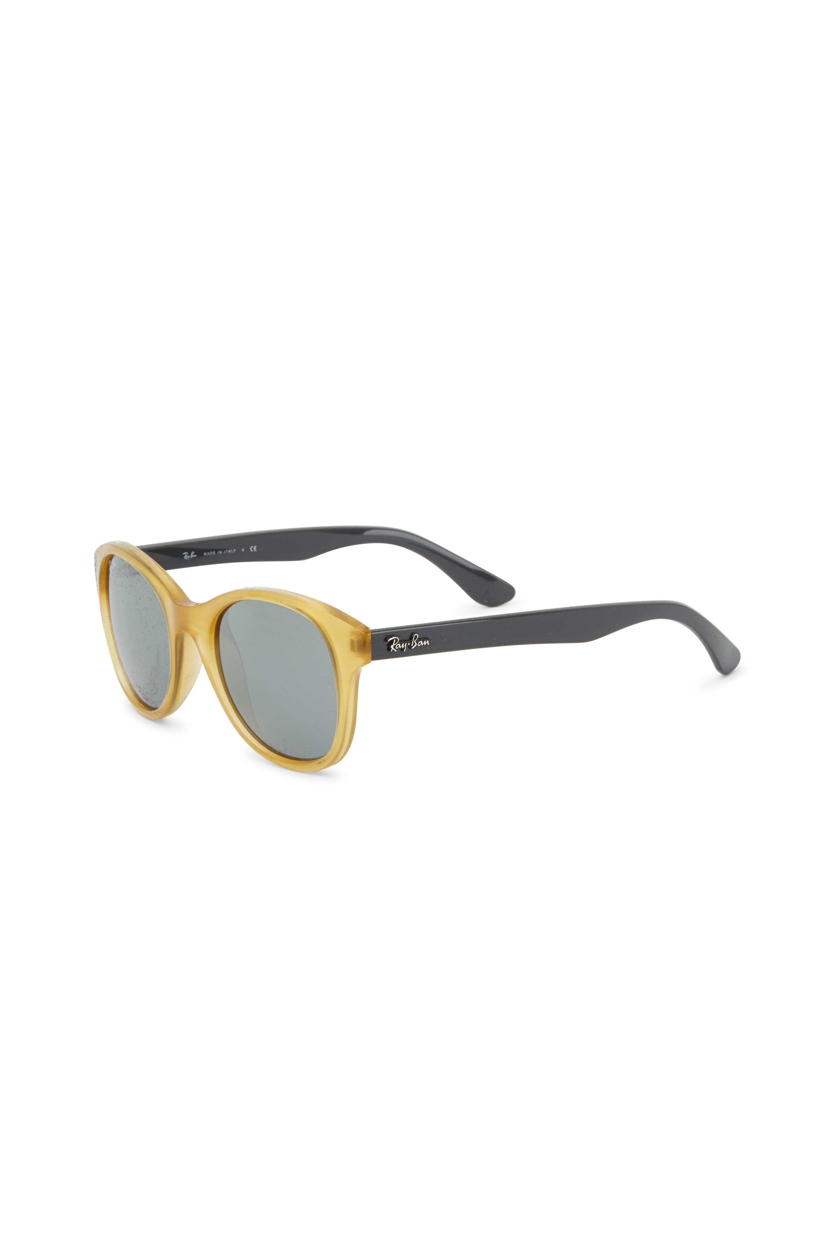 Frame material: acetate. Frame color: yellow transparent & grey. Lens color: grey solid. Lens shape: round. Made in Italy. 51mm lens width. 20mm bridge width. 140mm temple length. Lens treatment: non-polarized 100% UV protection.