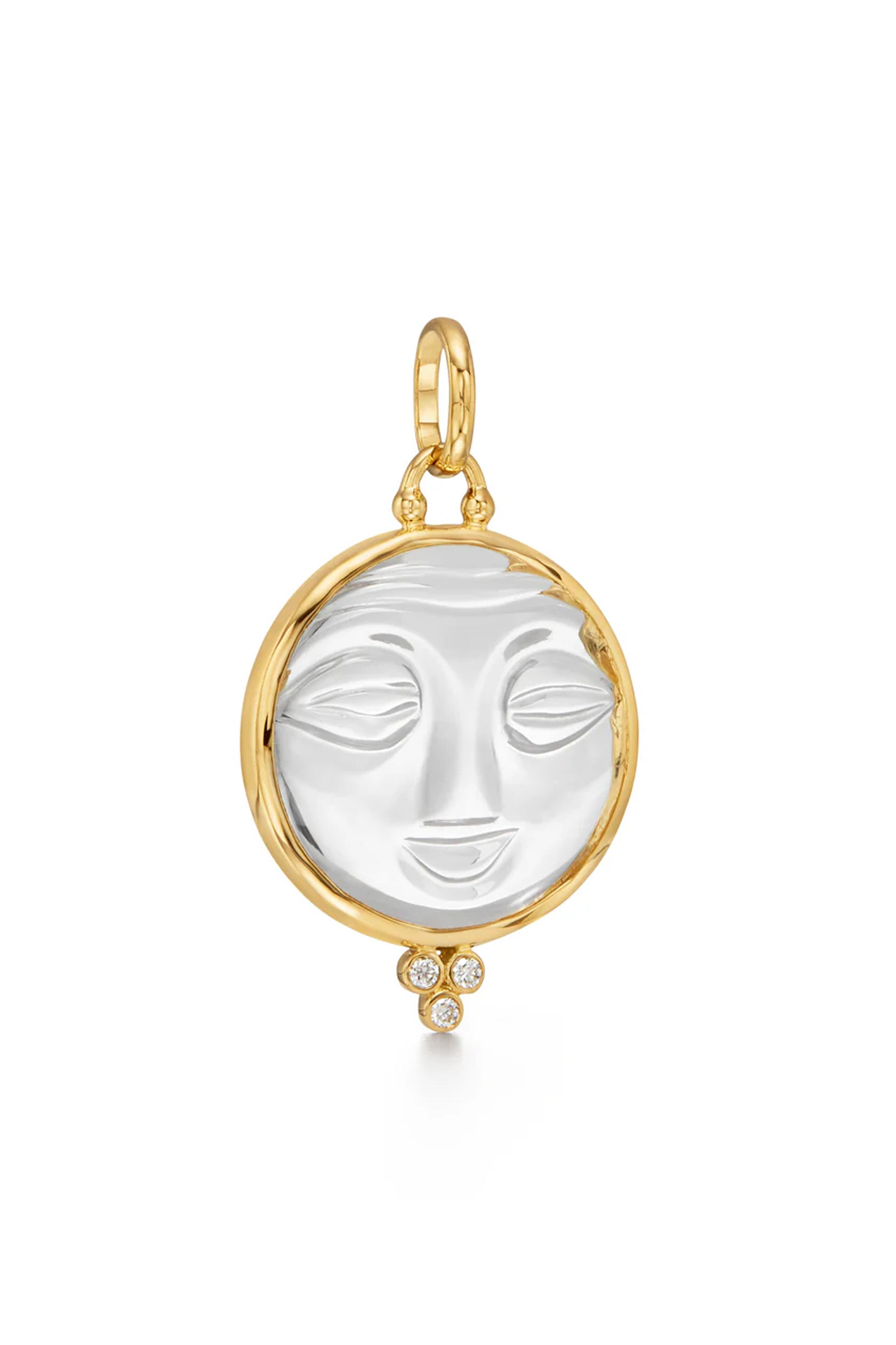 18k gold. Diamond 0.09 total carat weight. Natural rock crystal. Moonface design. Engraved design. Gold bezel. Hinge bail. Made in Italy. Length: 1.8”. Width: 1”.