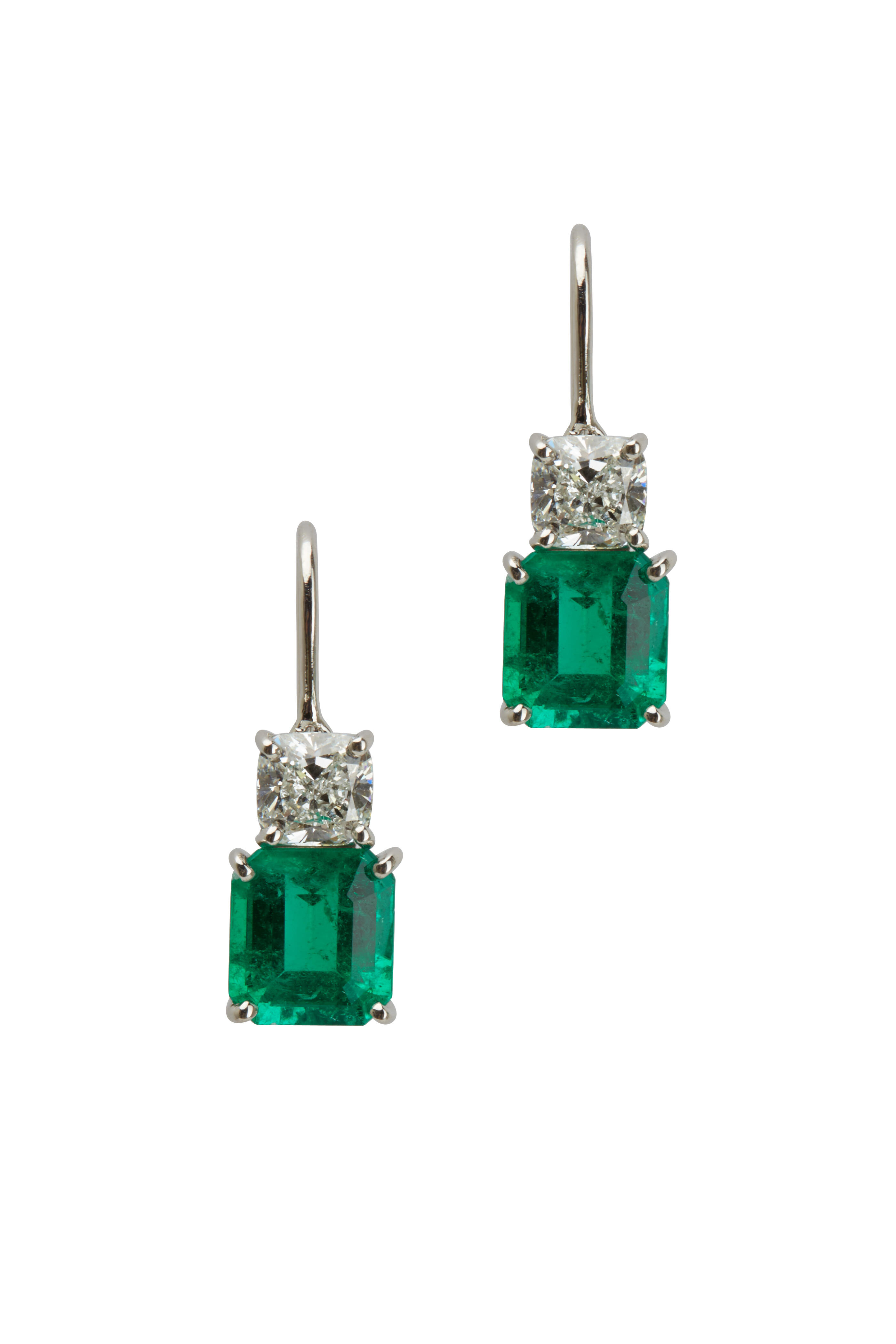 Platinum. 2.59cts green emerald gemstone. 2.94cts green emerald gemstone. 2.01cts (2) cushion-cut white diamonds.