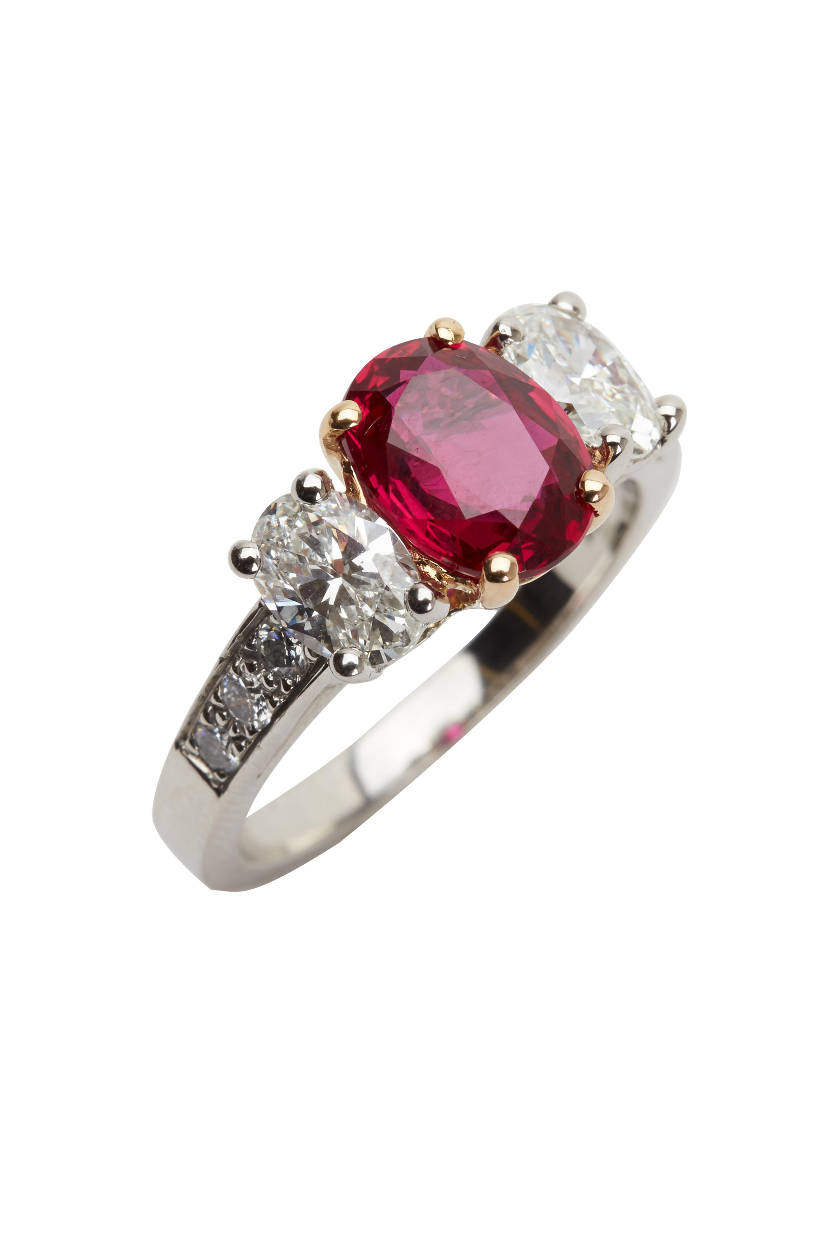 Platinum & gold. 2.14cts oval-cut red ruby gemstone. 1.04cts (2) oval-cut diamonds. 0.17cts round-cut diamonds.
