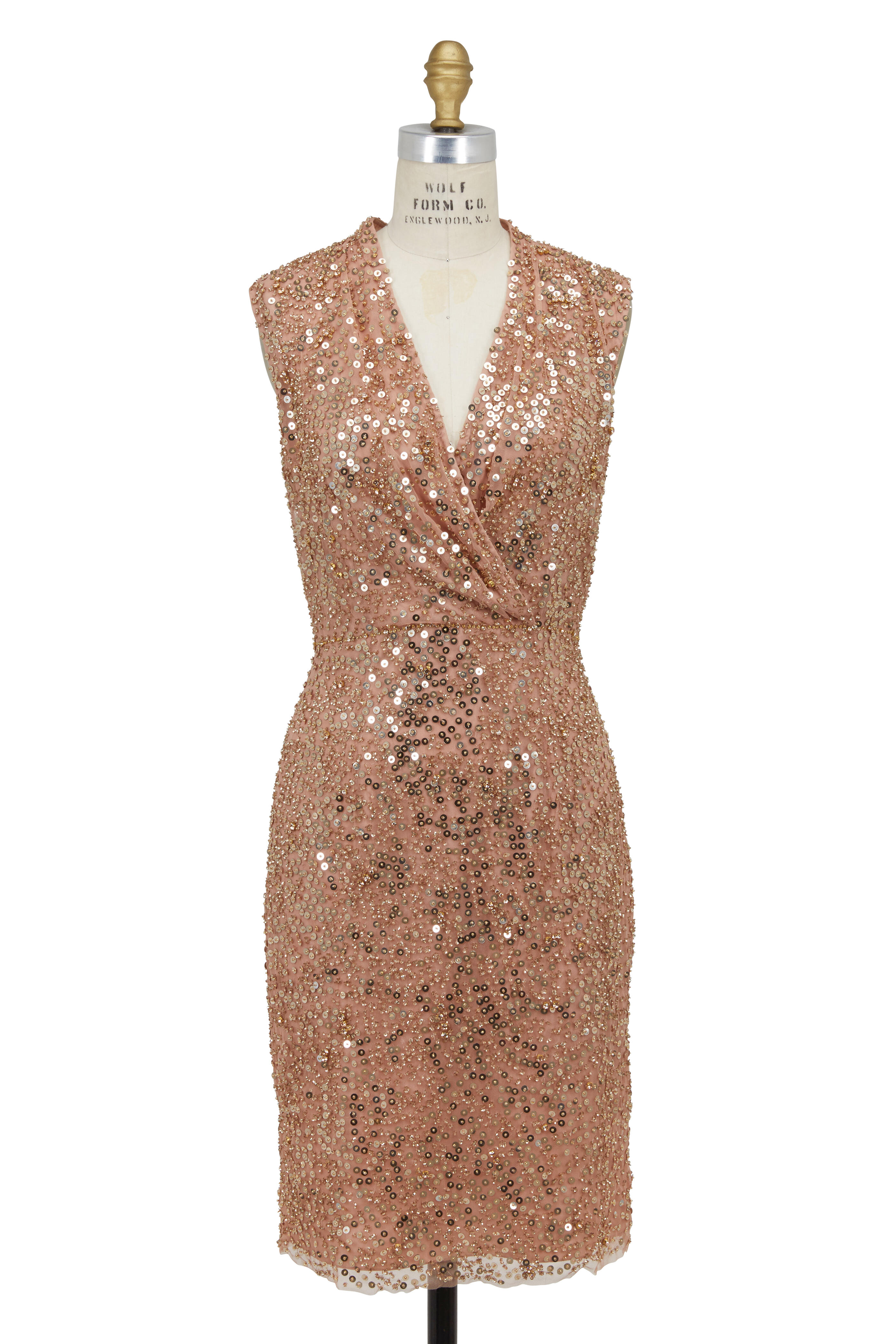Draped V-neckline. Concealed back hook and zip closure. Cross-over front. Straight hem. Allover sequins. Imported. Body: 100% polyester; fully lined.