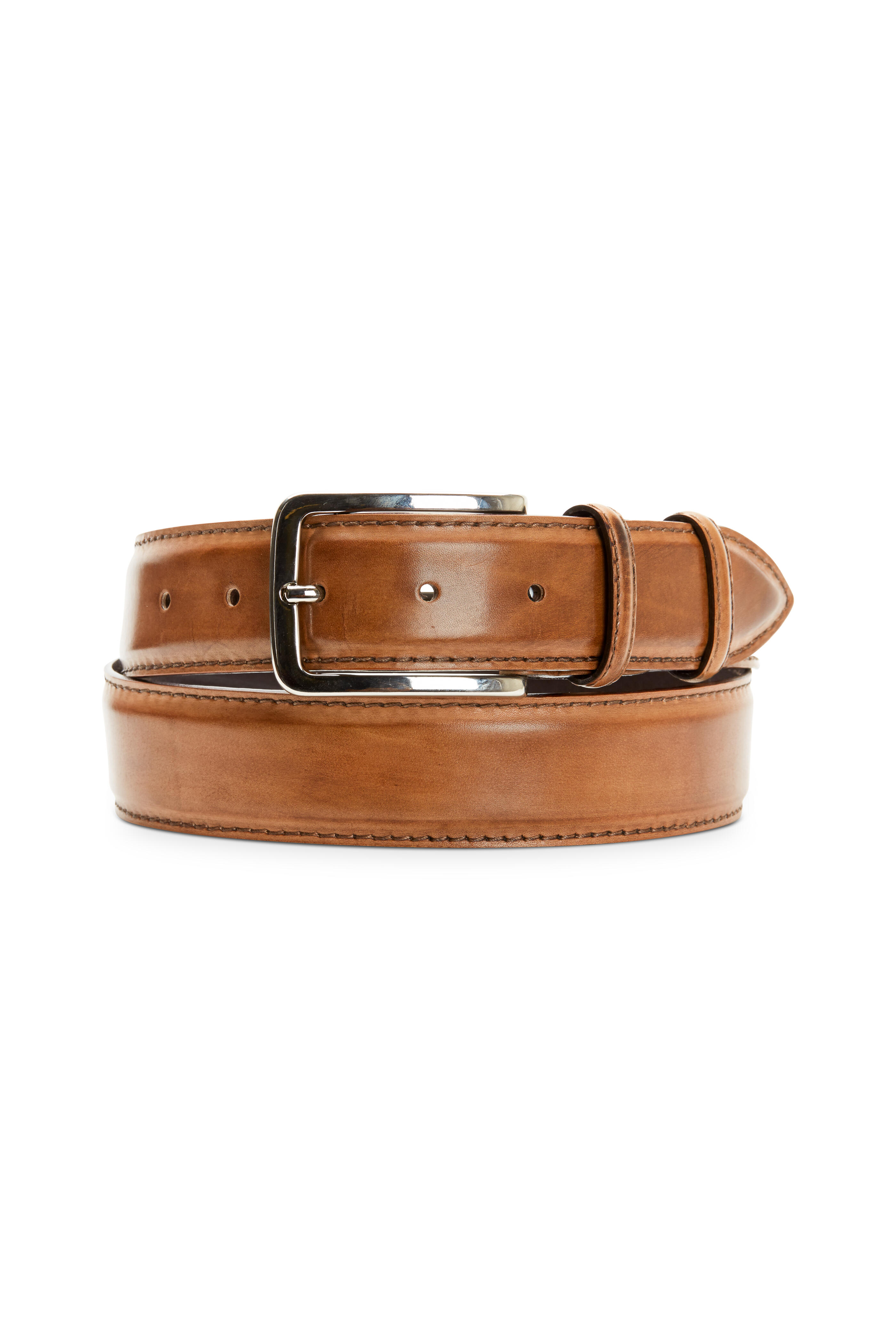 Genuine leather. Nickel-plated solid brass buckle. Double loop keeper. Tapered tip. Made in Italy.