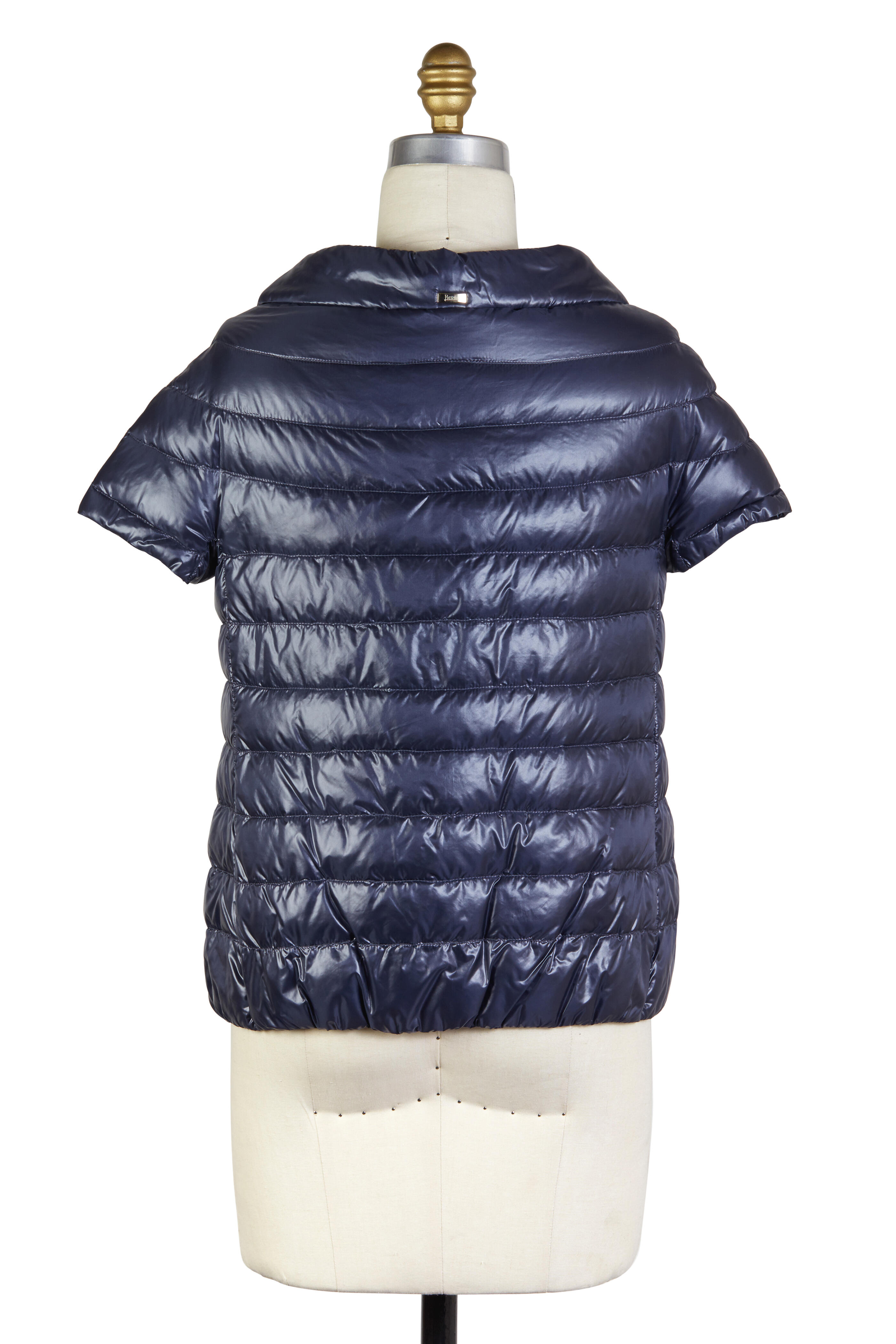 Funnel neckline. Concealed button-snap front closure. Cap sleeves. Side seam pockets. Made in Romania. 100% polyamide; filling: 95% goose down, 5% feather. Hand wash.