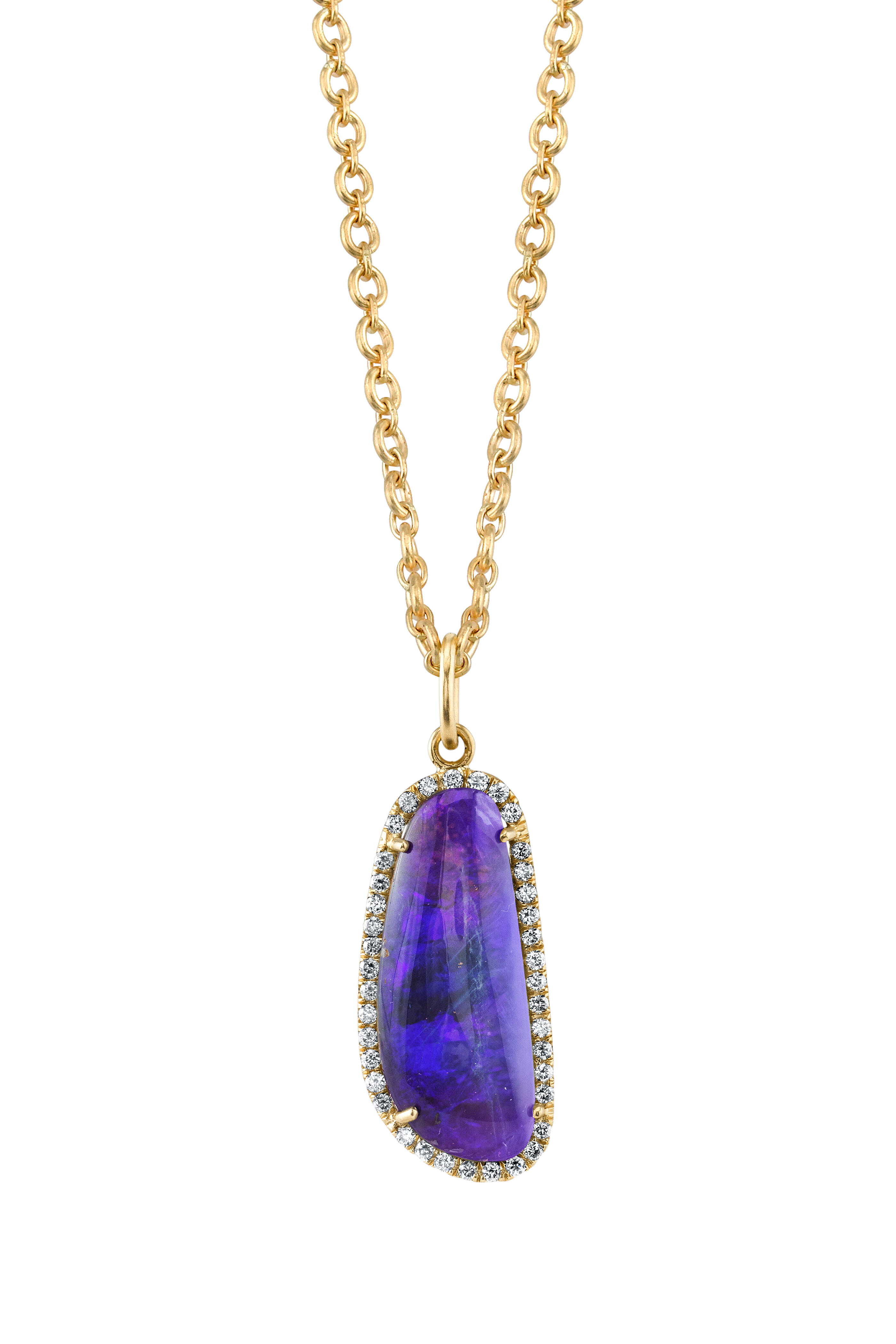 18k yellow gold. 17.6cts boulder opal gemstone. 0.67cts pavé-set white diamonds. 18" chain. Limited edition.