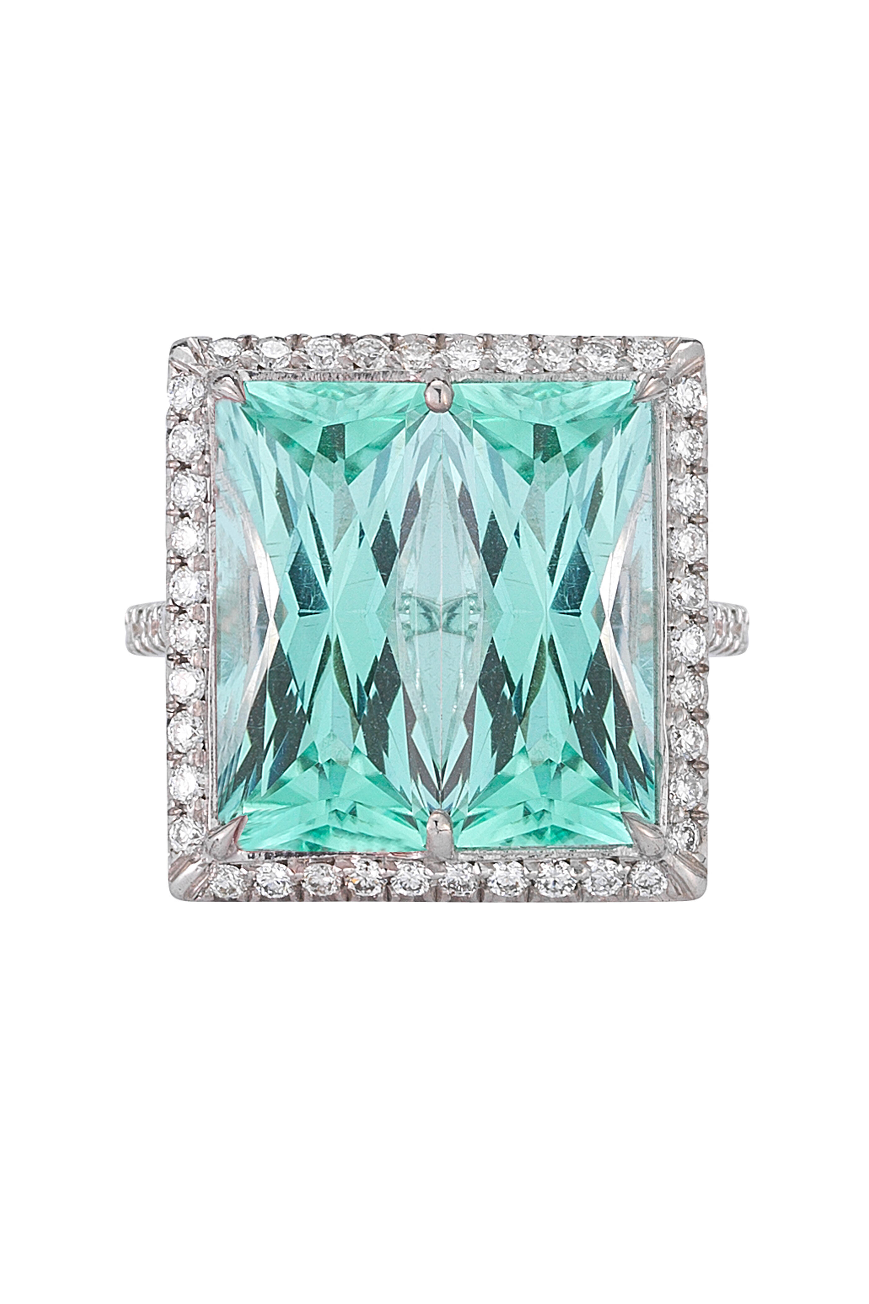 18k white gold. 8.06cts mint tourmaline gemstone. 1.24cts white diamonds. Cocktail ring.