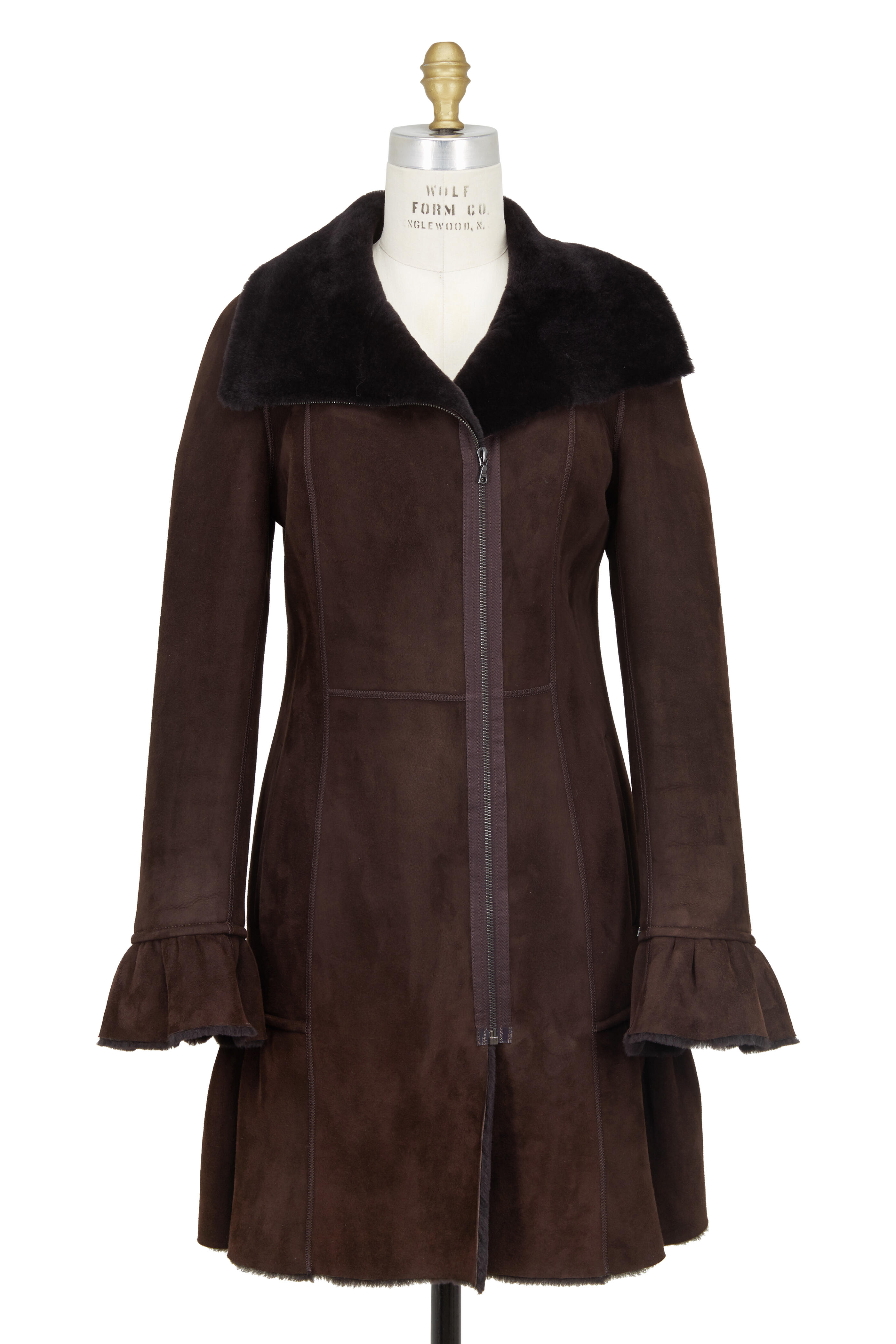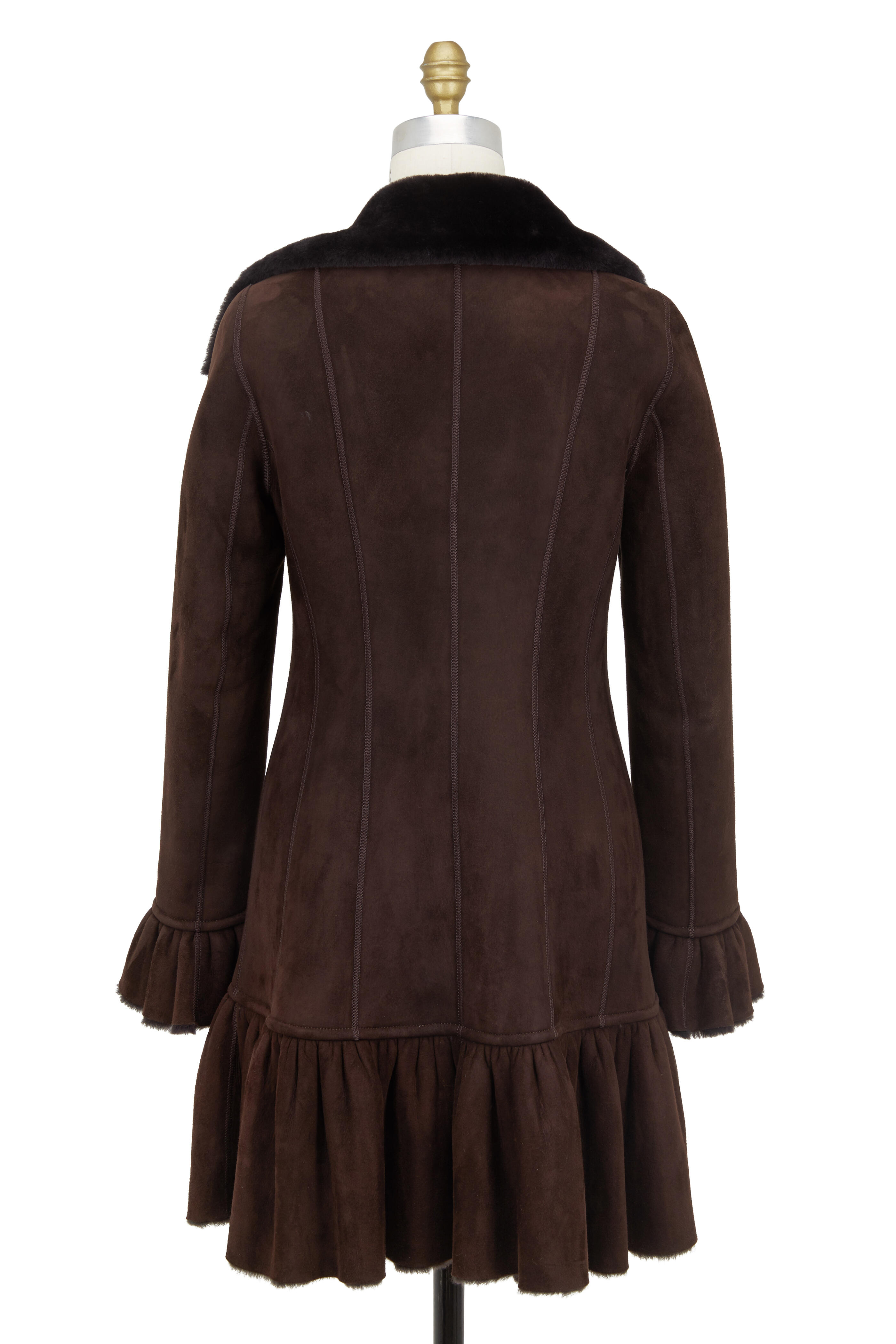 Shearling. Specialist clean. Shawl collar. Button front closure. Fluted cuffs. Side slash pockets. Ruffled hem. Imported. 34" shoulder to hem.