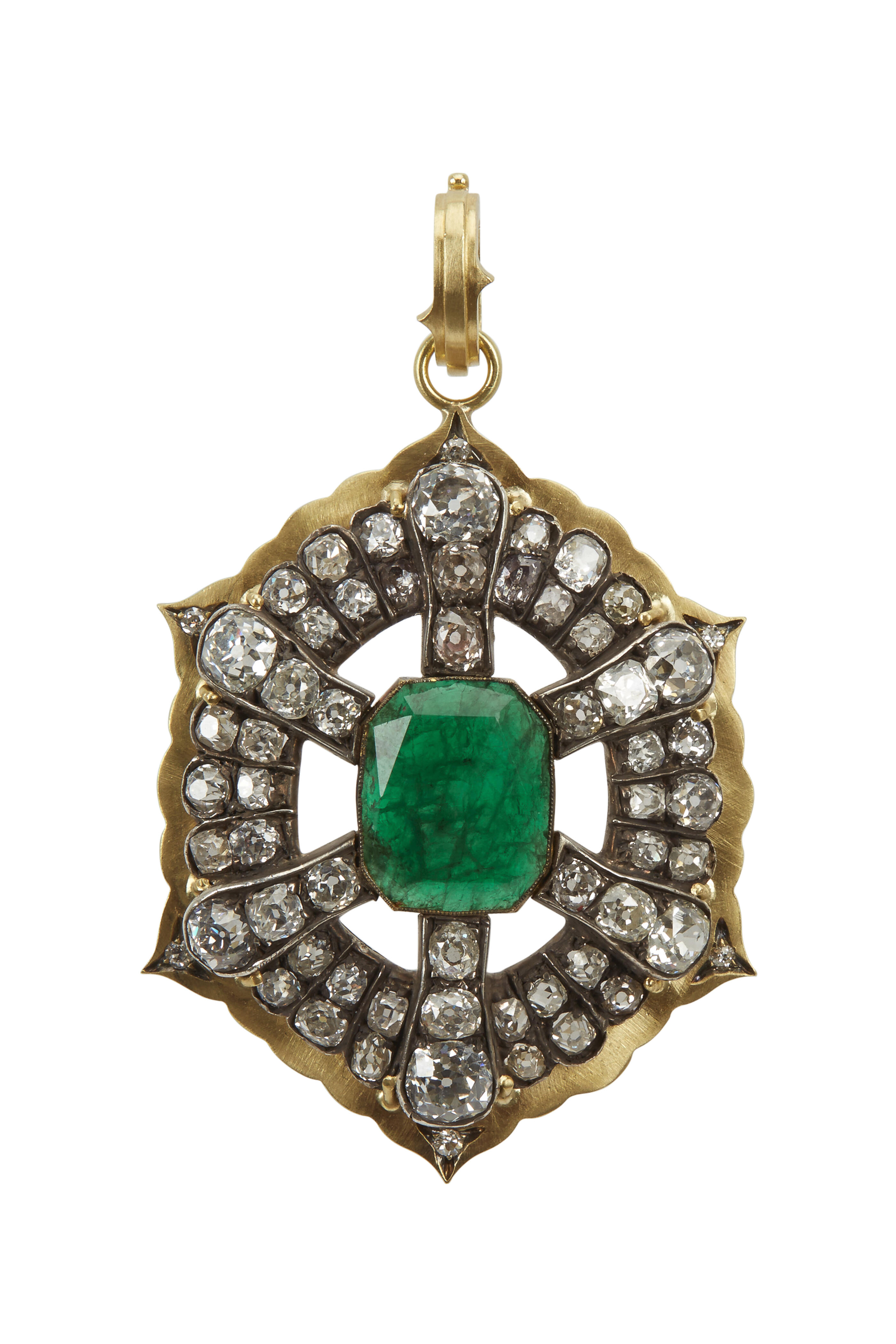 18k yellow gold & sterling silver. 6.50cts Georgian emerald gemstone center. 0.17cts old European-cut diamonds.