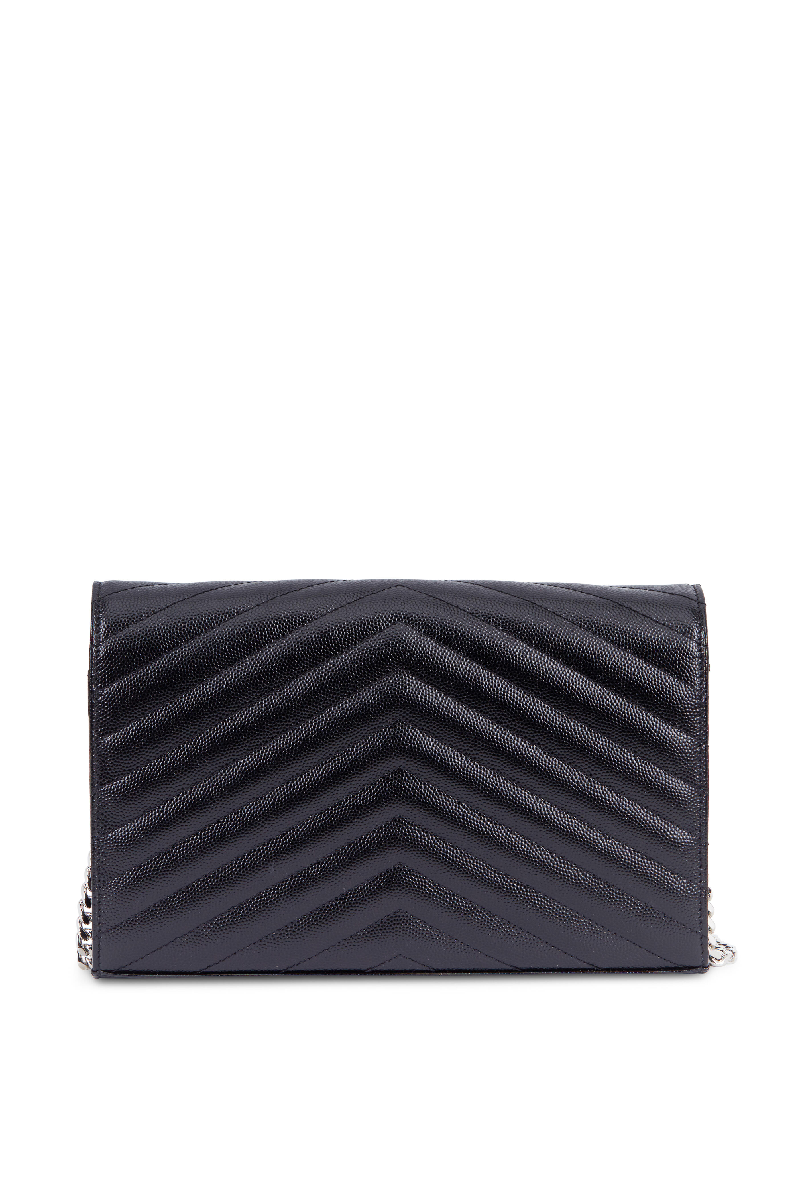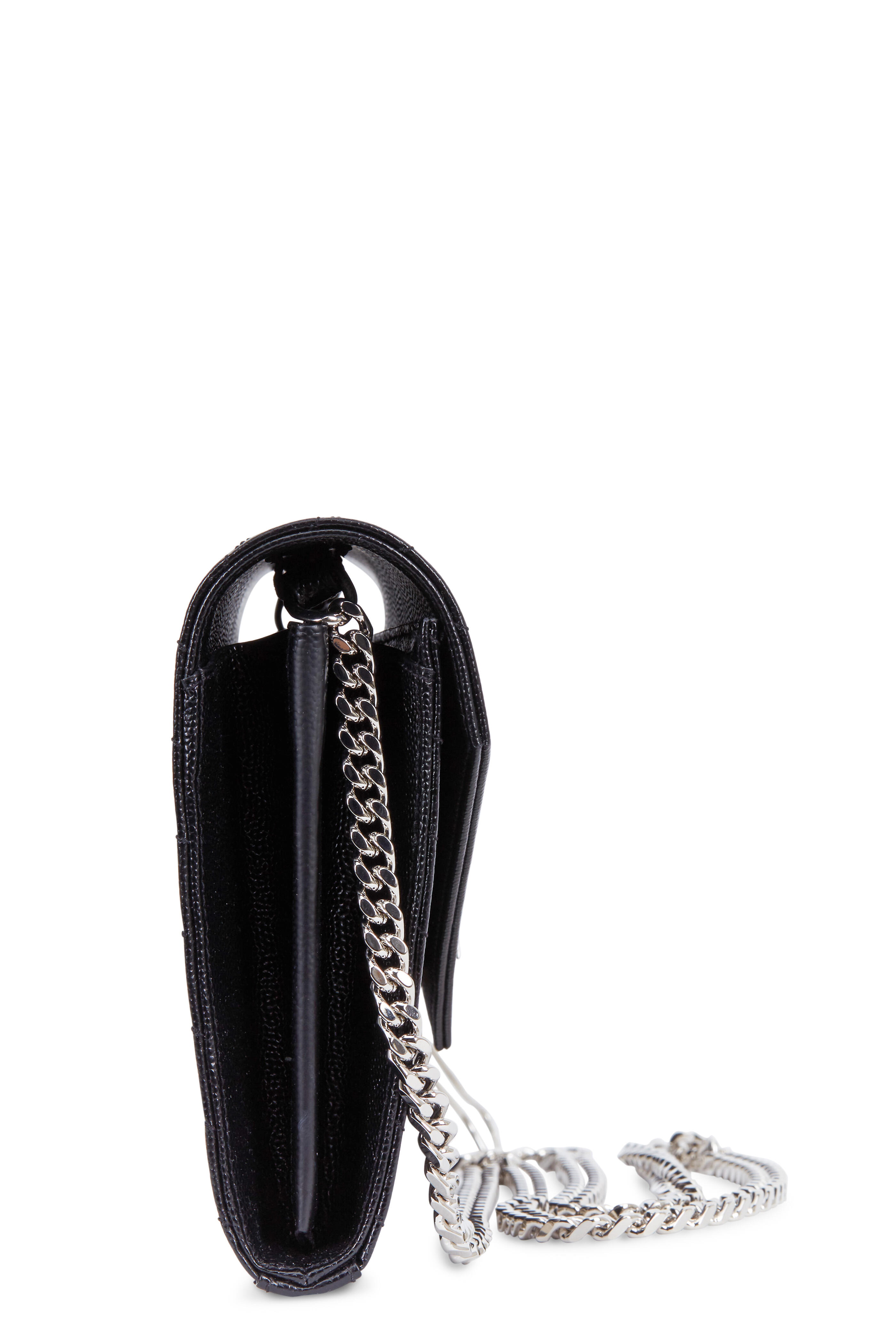 Detachable silver-toned chain strap. Flap front with snap closure. Silver-toned YSL logo. Interior zip pocket, two open compartments, two slot compartments and twenty card slots. Lined in leather. Made in Italy. Width: 8 ¾". Height: 6". Depth: 1 ¼". Strap drop: 19". 100% calfskin.