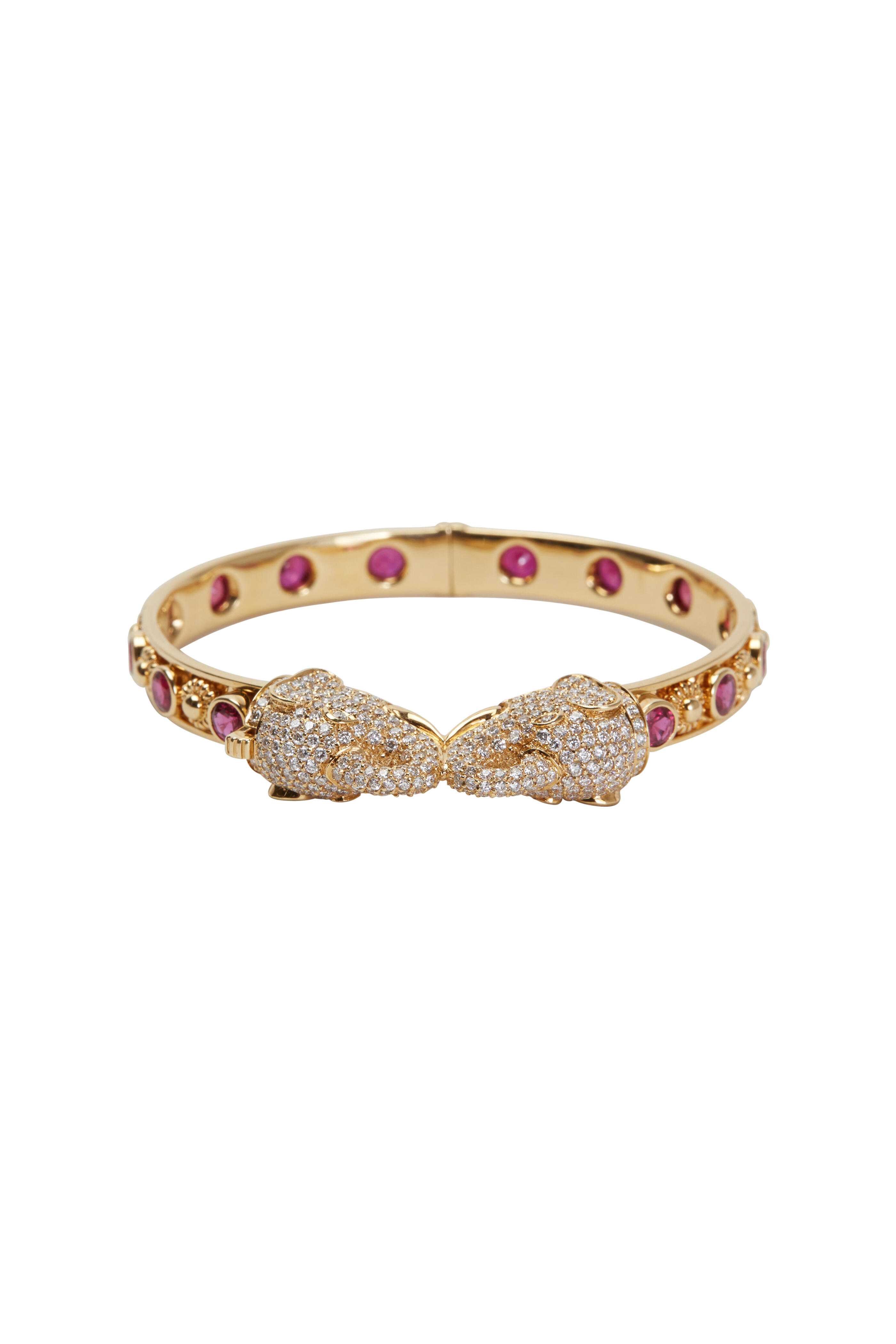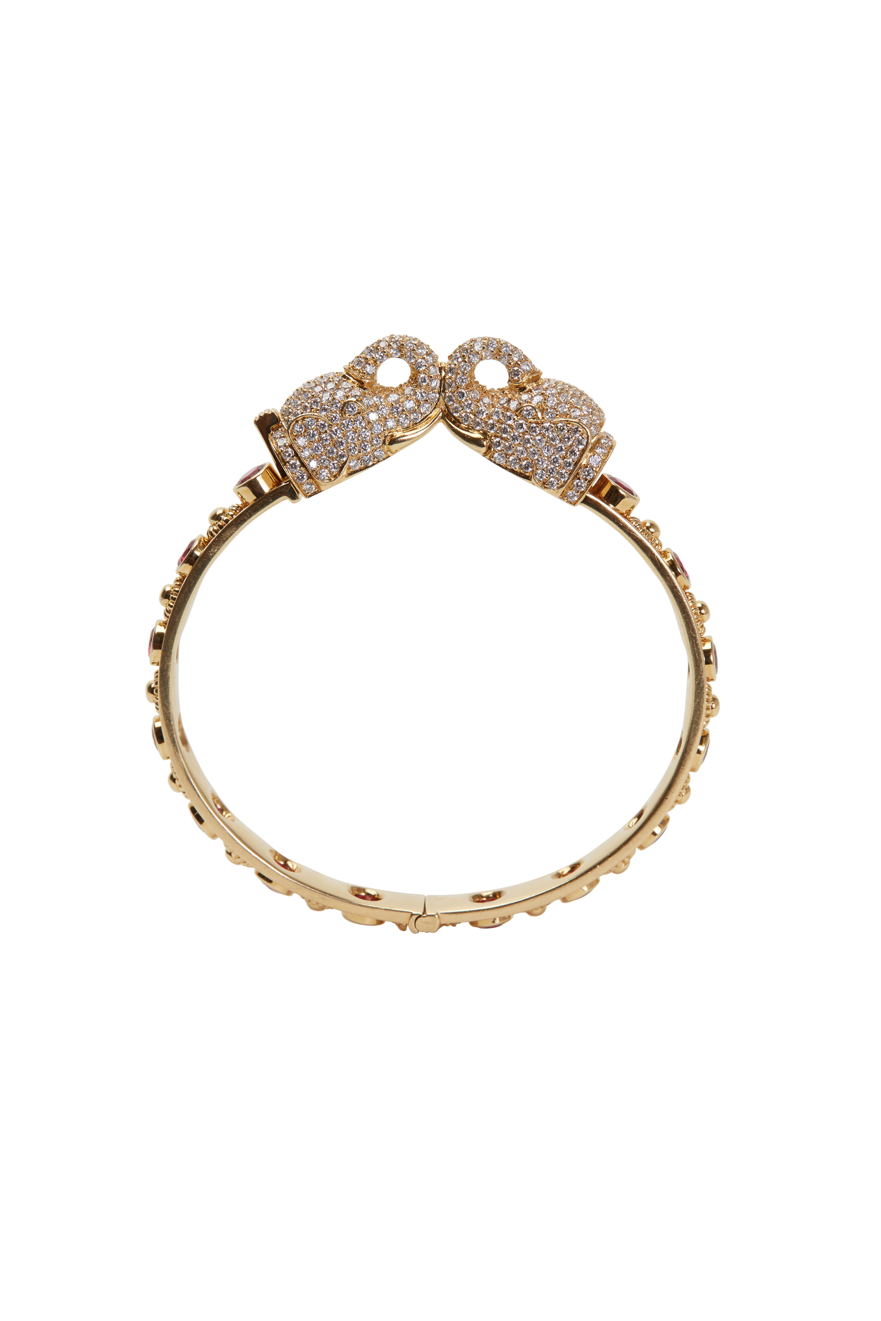 18k yellow gold. Red ruby gemstones. White diamonds. Elephants.