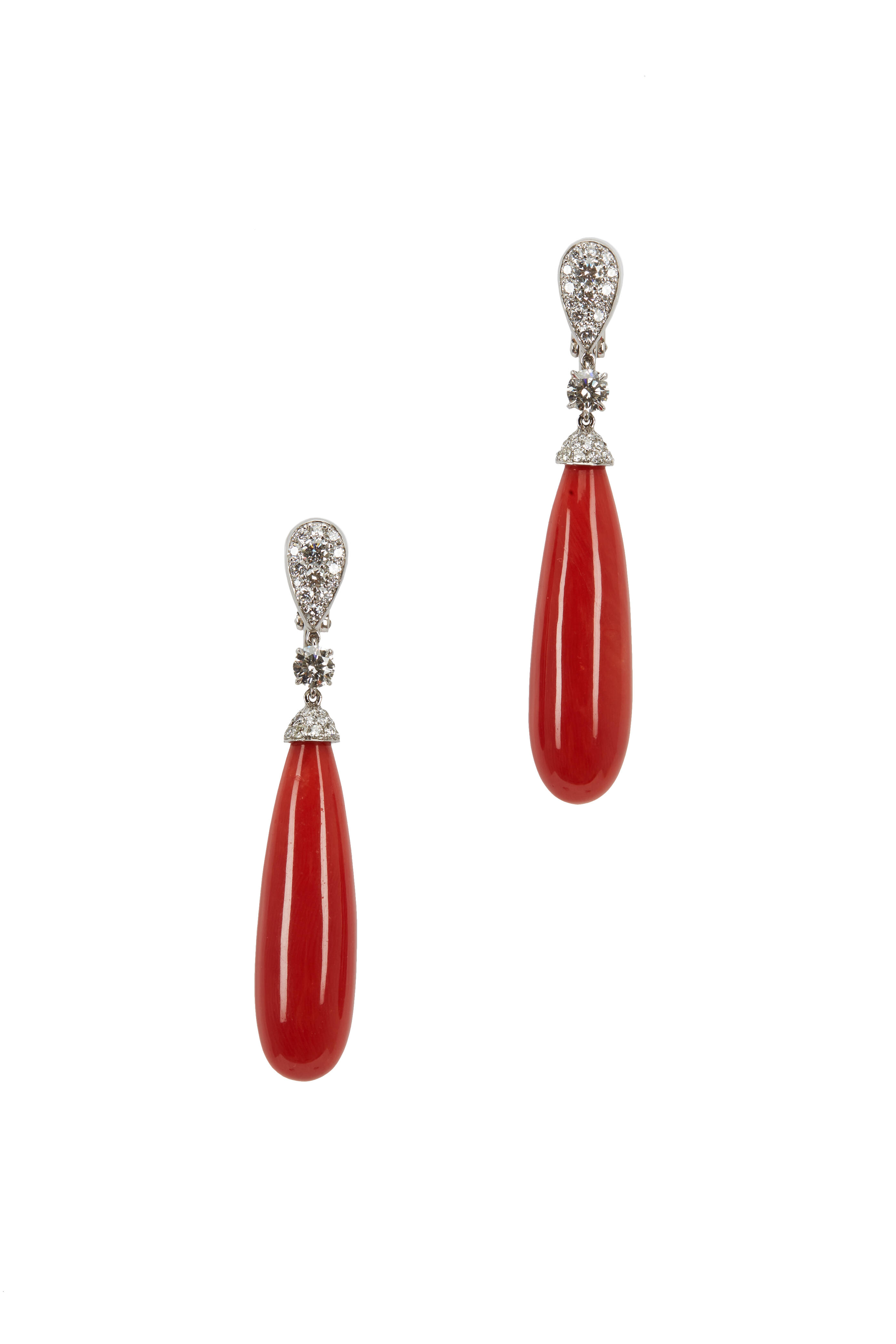 Platinum & 18k white gold. Red coral. 0.52cts round, brilliant-cut white diamonds. 0.92cts white diamonds. Dangle earrings.