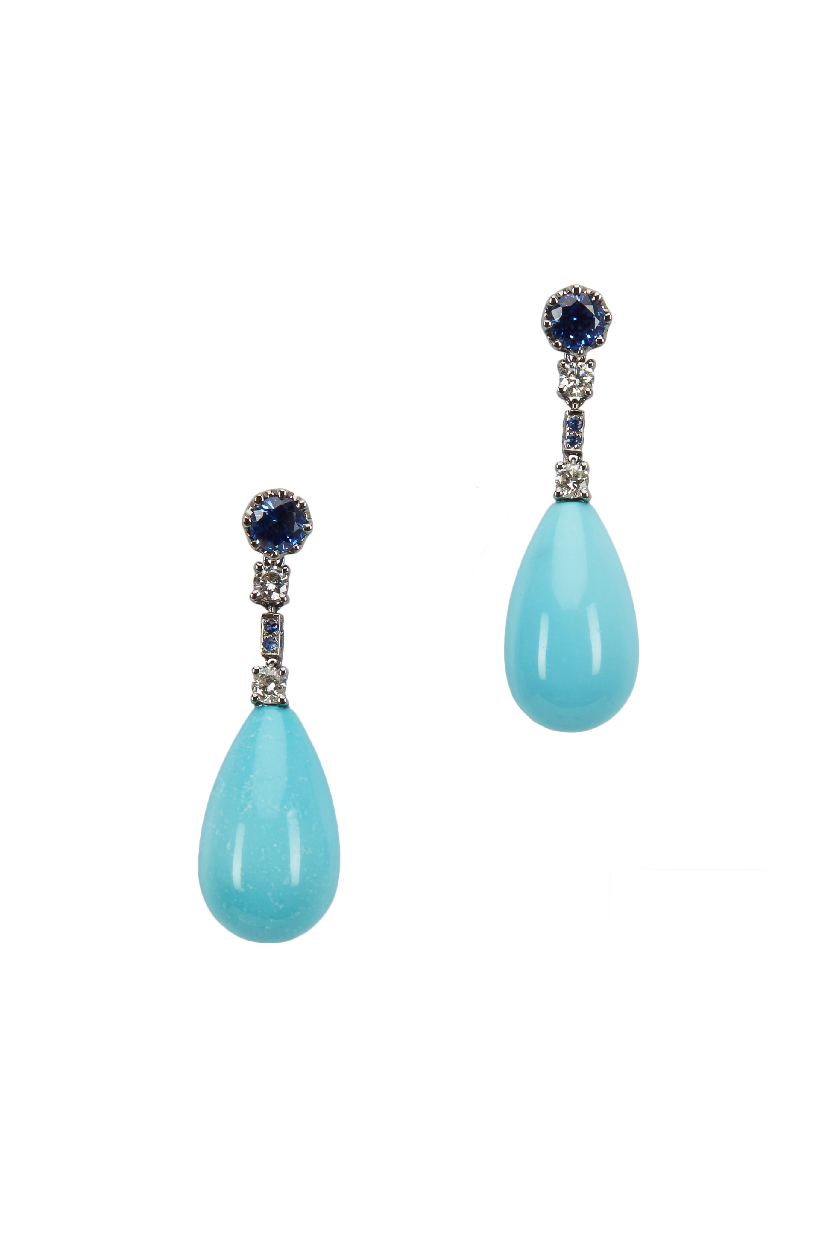 18k white gold. 20.67cts turquoise gemstones. 0.61cts sapphire gemstones. 0.21cts round, brilliant-cut white diamonds. Dangle earrings.