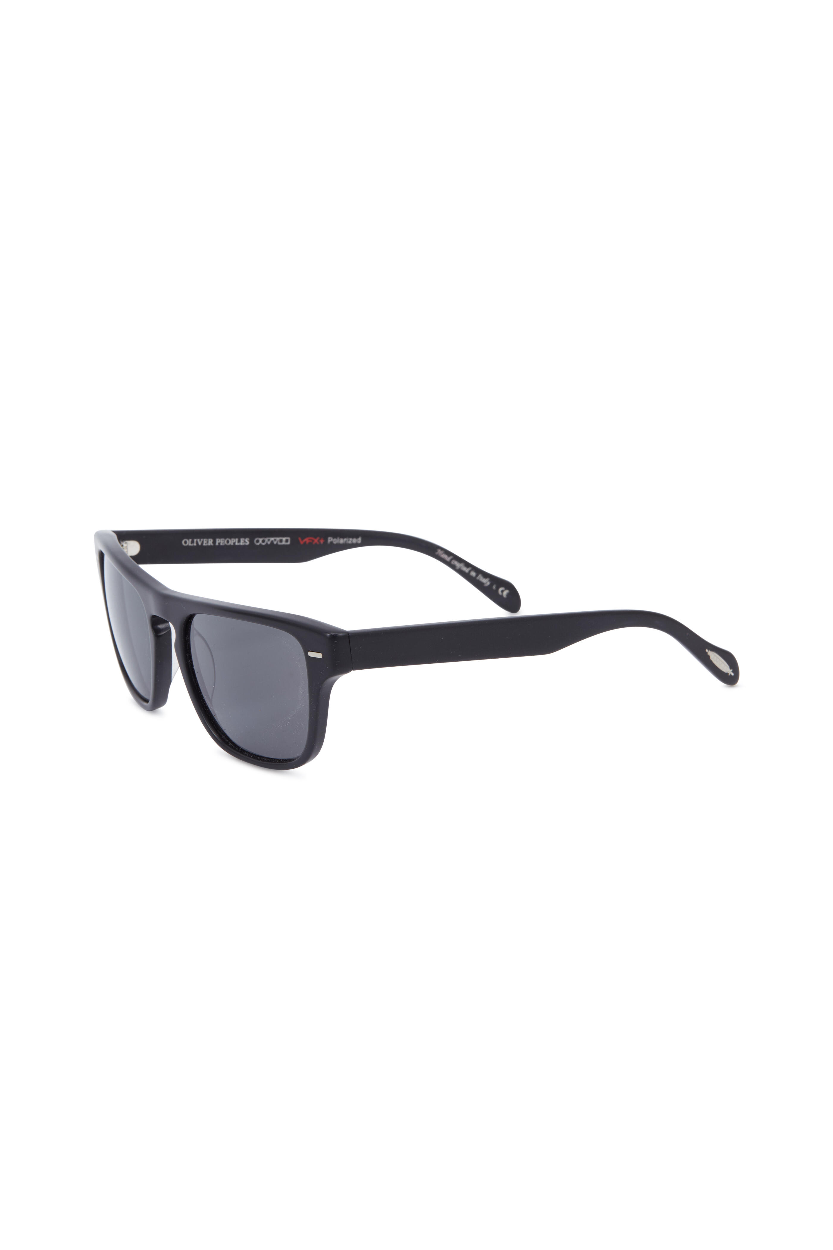 Frame material: acetate. Frame color: semi-matte black. Lens color: graphite. Lens shape: square. Handcrafted in Italy. Style: OV5282SU-0454. Lens width: 54 mm. Bridge width: 20 mm. Temple length: 145 mm. Lens treatment: VFX+® polarized glass lens with infrared coating; 100% UVA/UVB protection.