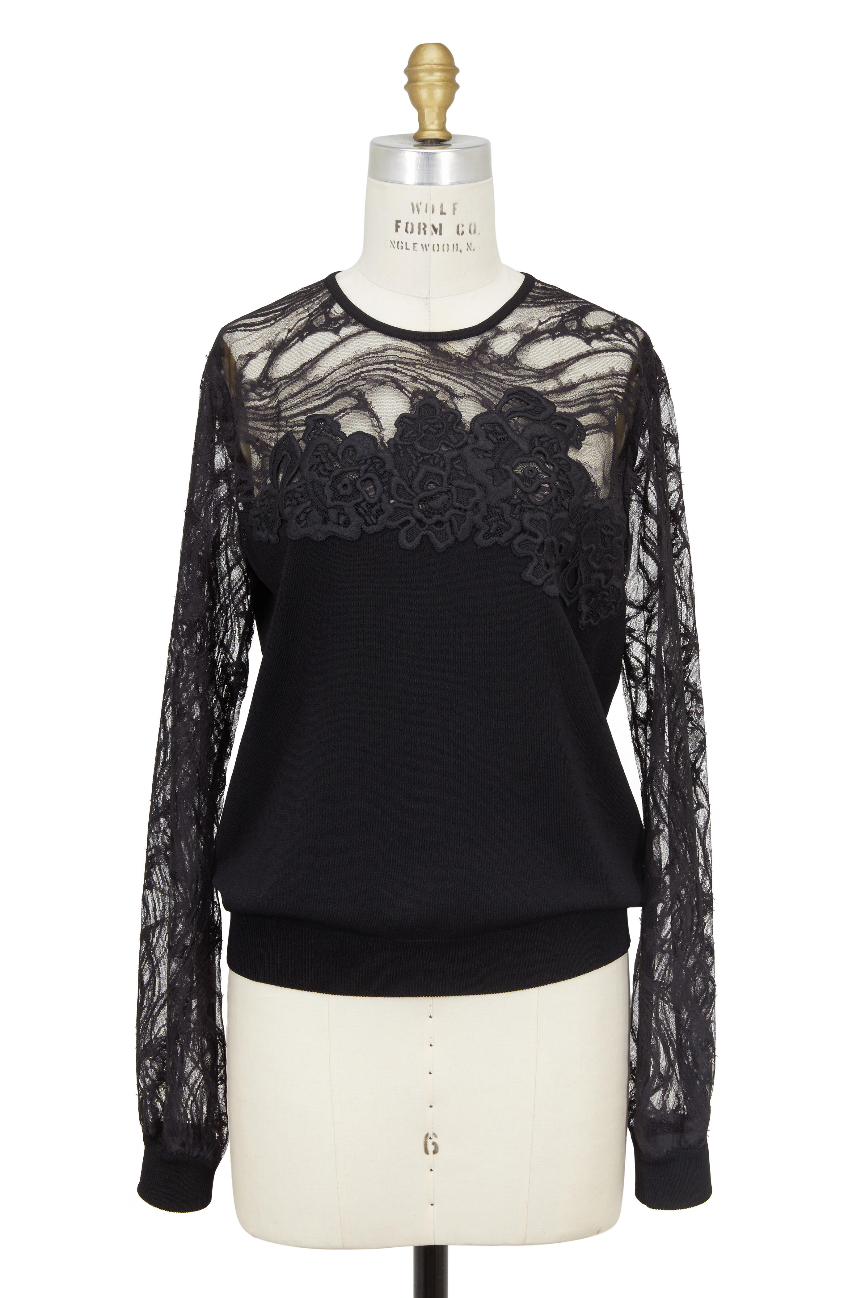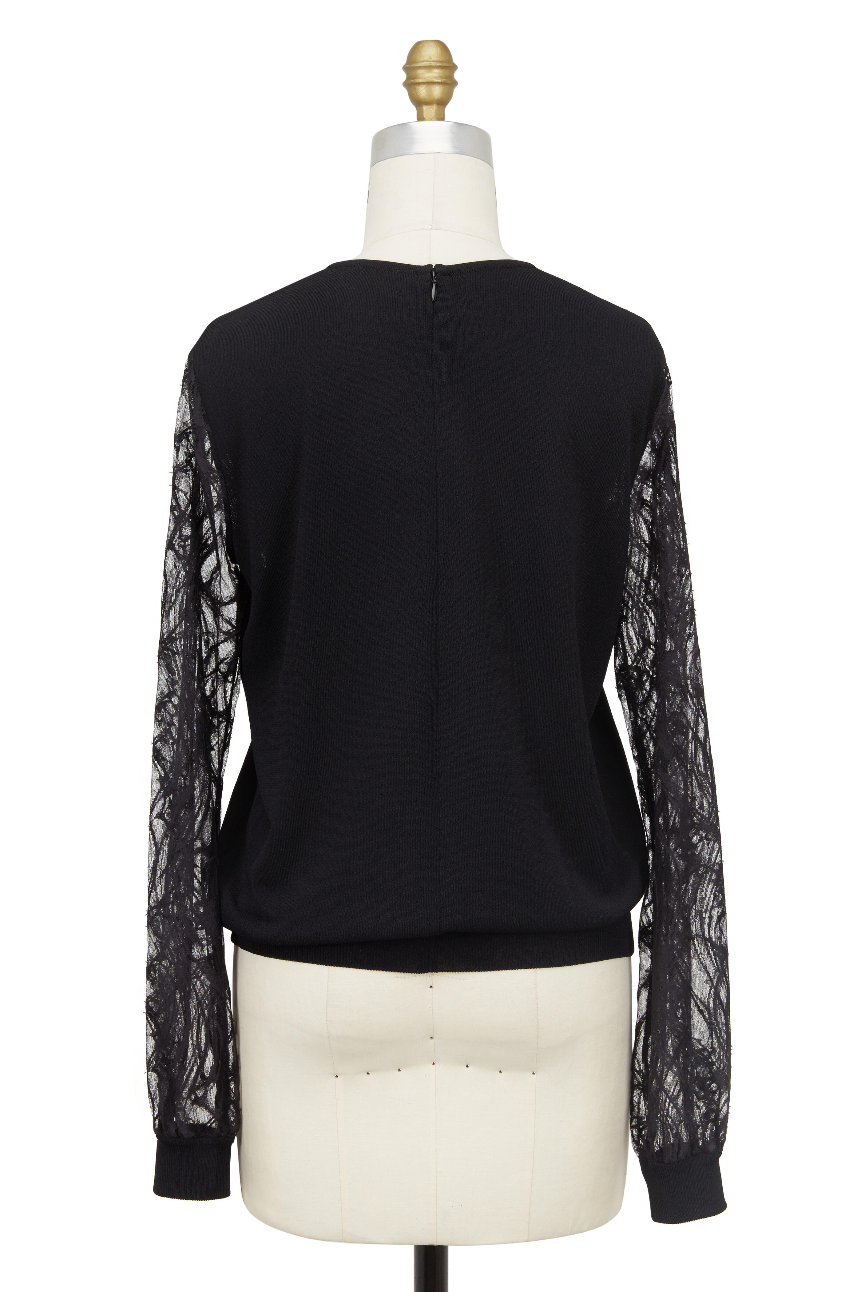 Round neckline. Concealed back zip closure. Sheer embroidered lace sleeves. Ribbed trim. Made in Italy. 60% viscose, 23$ polyester, 11% cotton, 6% polyamide. Dry clean.