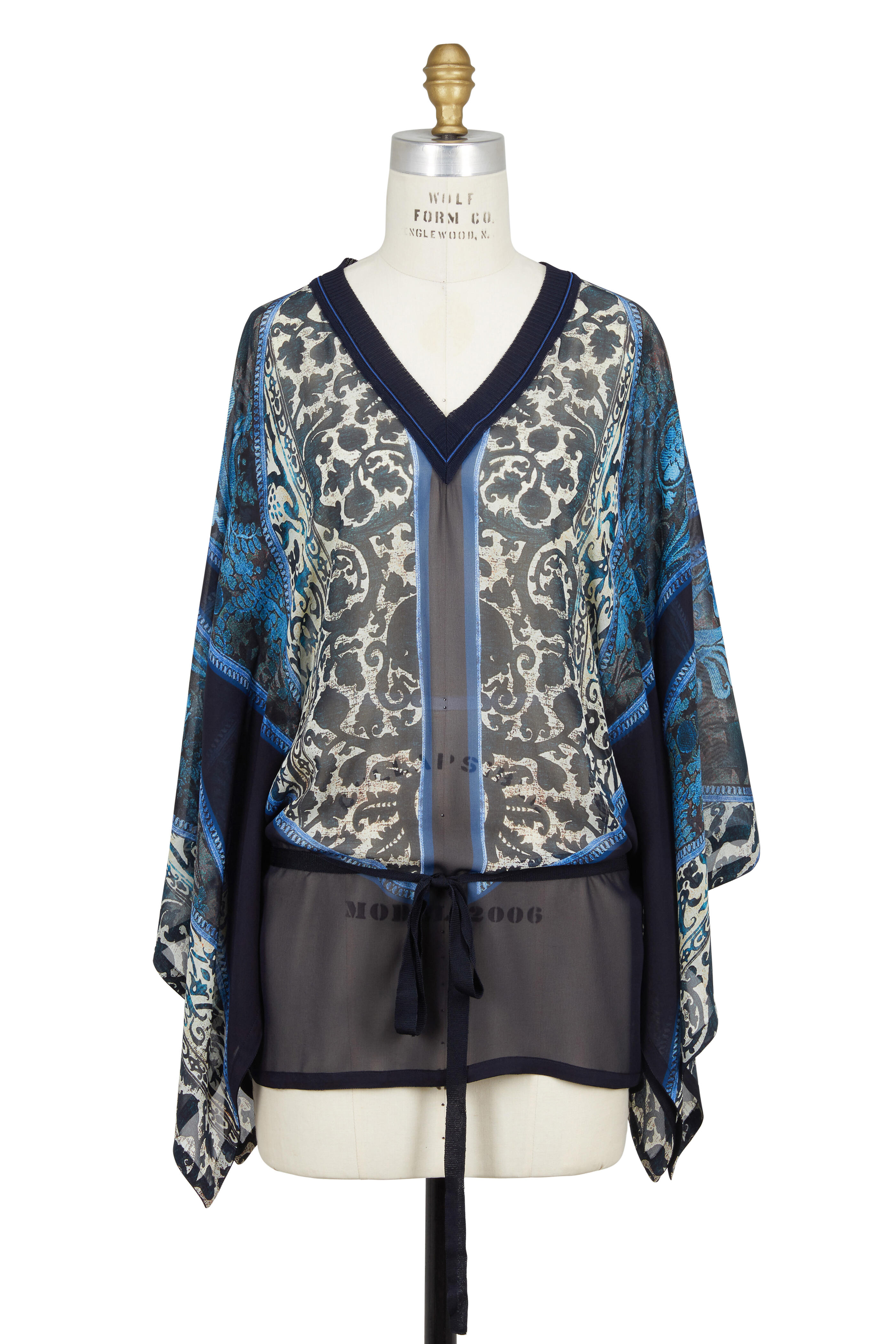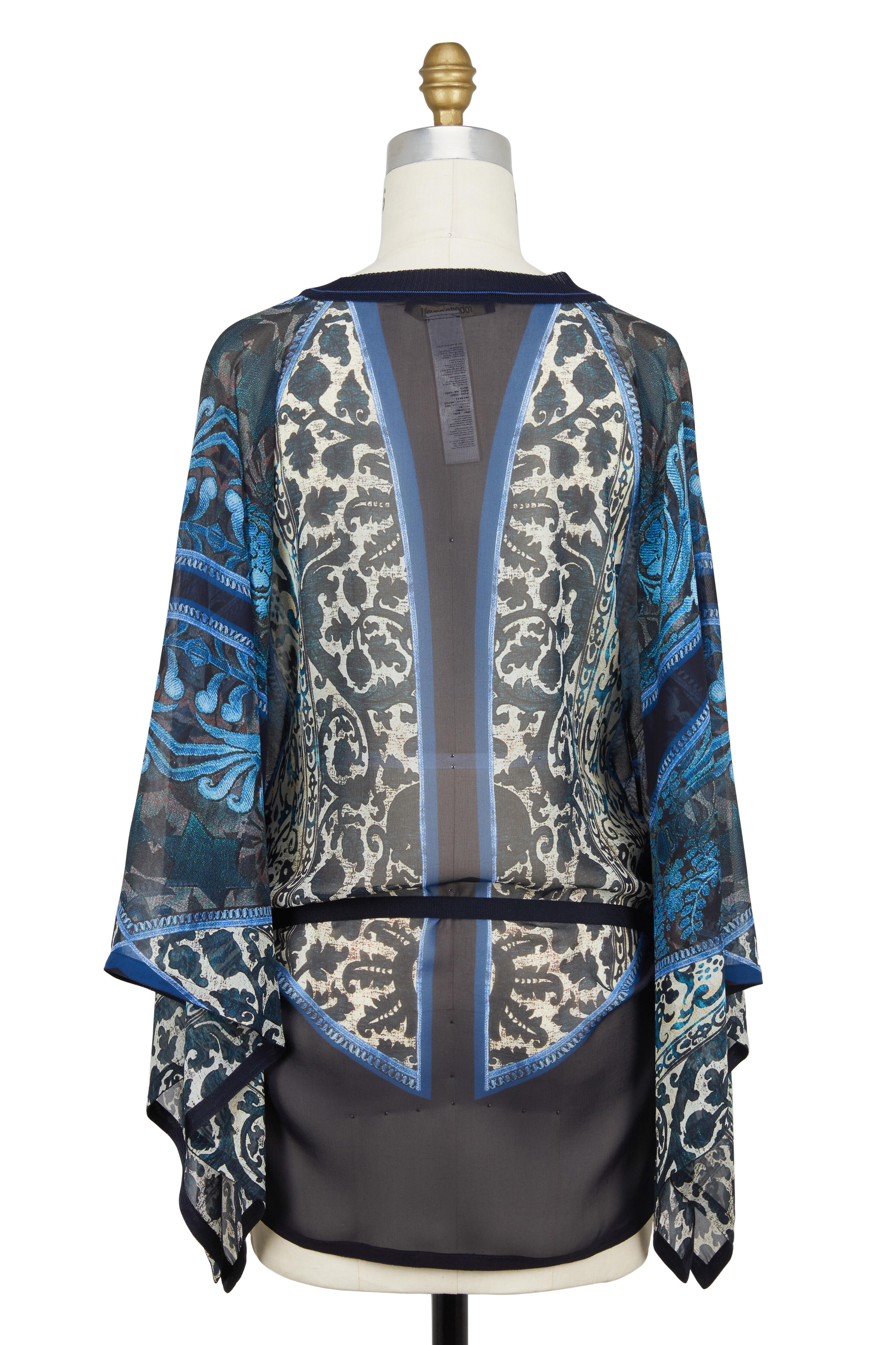 Blue Sheer Silk Print Kimono Sleeve Blouse