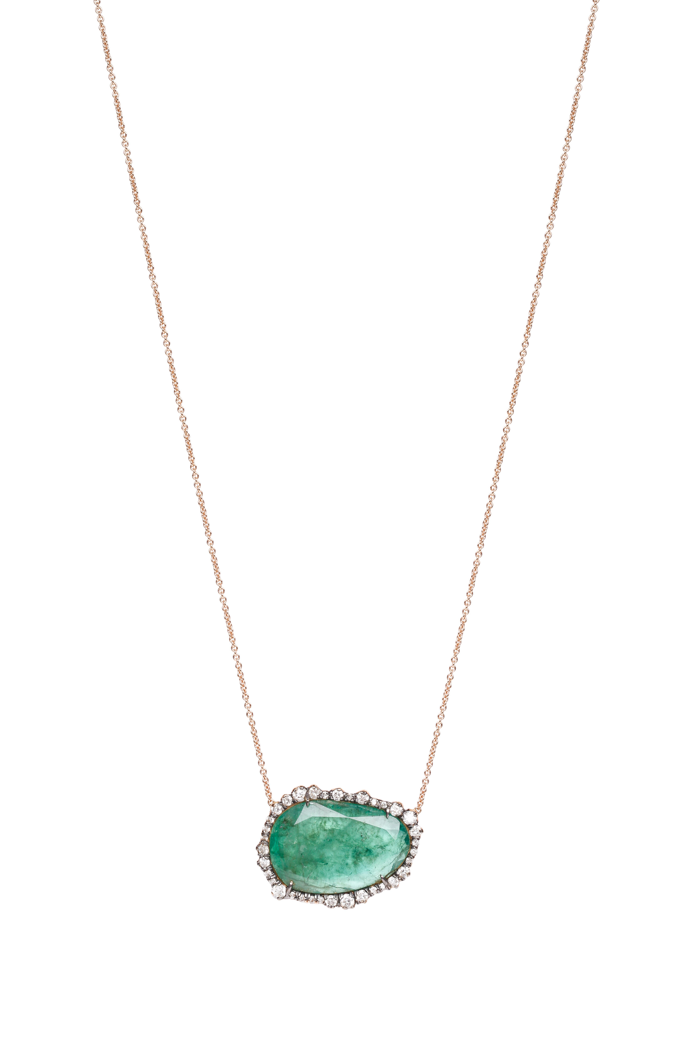 18K rose gold. 14.69CT emerald slice. .99CT irregular diamonds.