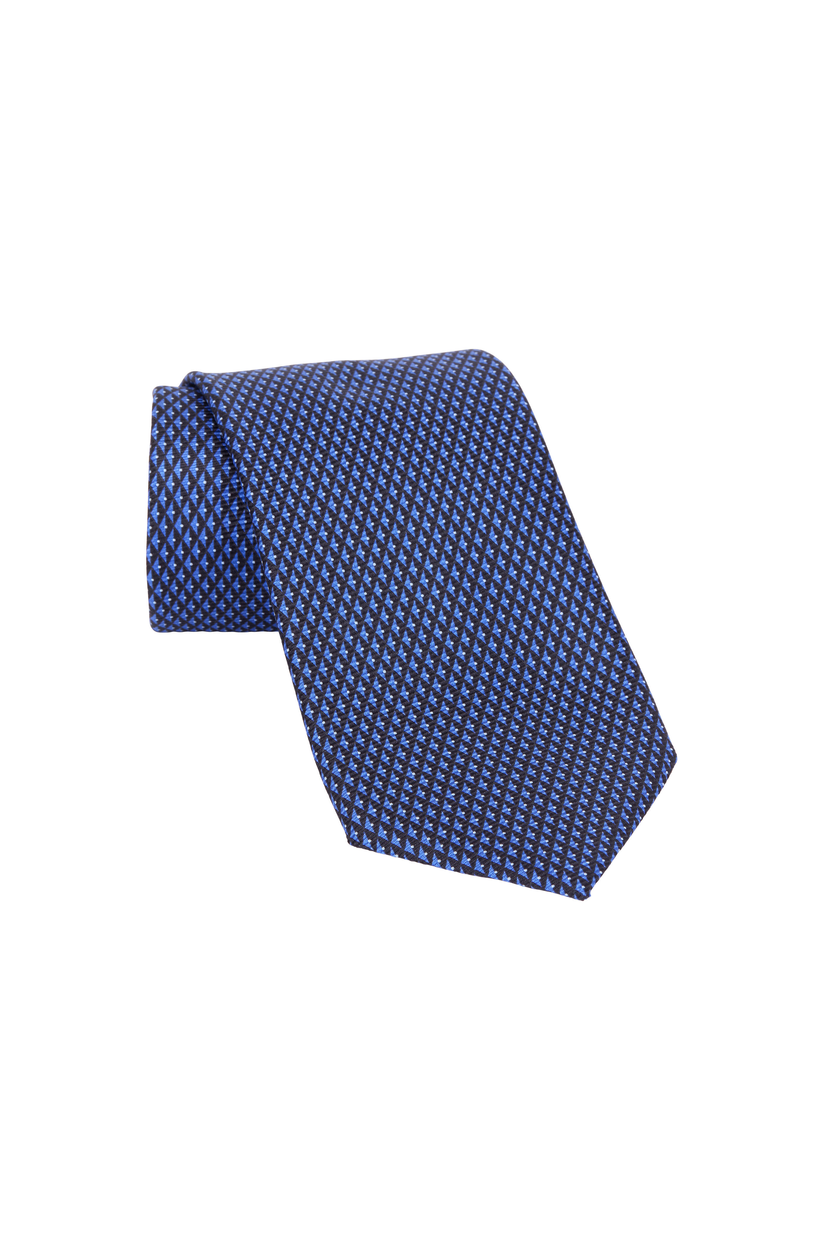 Geometric pattern. Made in Italy. Width: 8cm (3 ¼"). 100% silk. Dry clean.