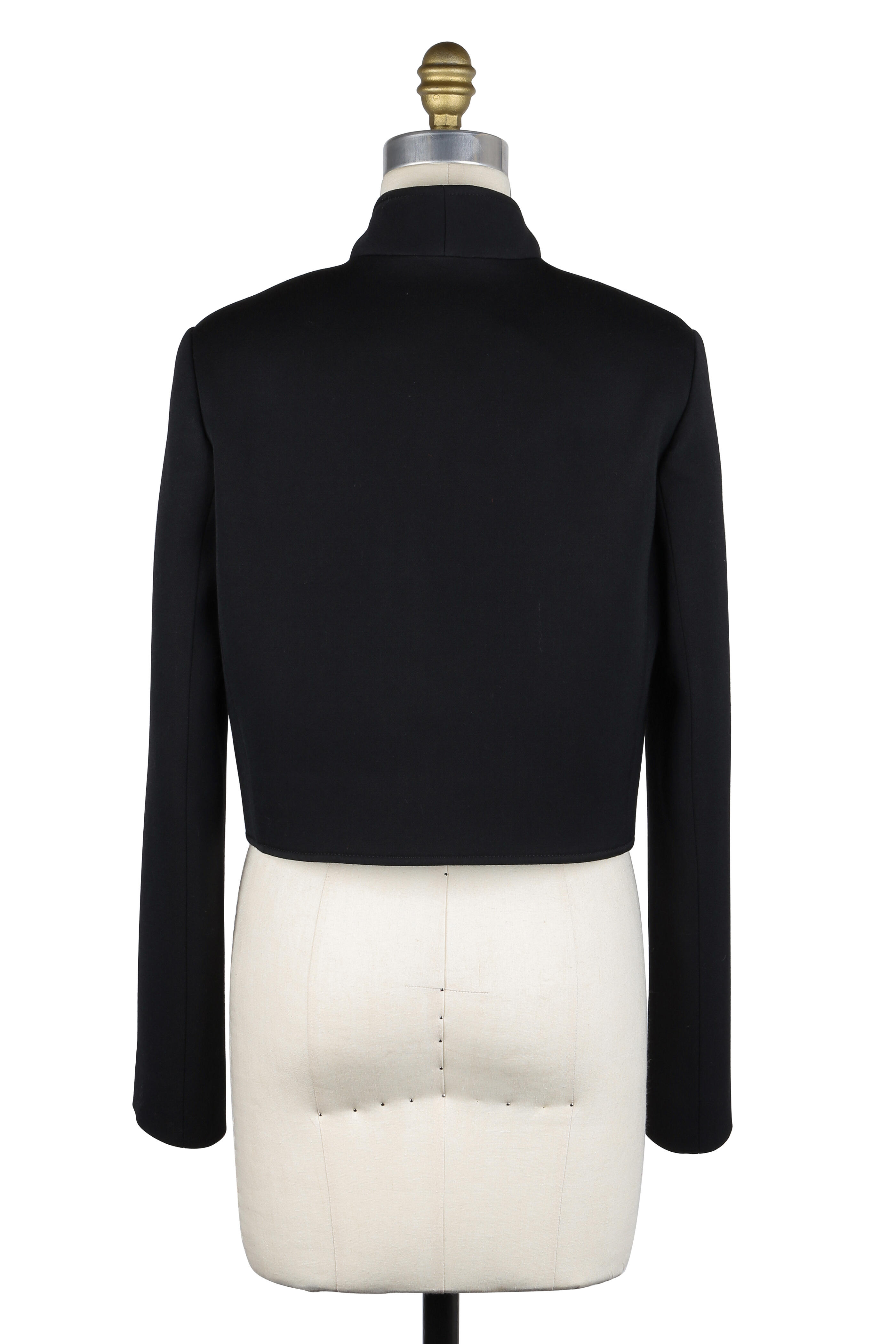 Stand collar. Open front. Made in Italy. 100% wool; lining: 100% silk. Dry clean.