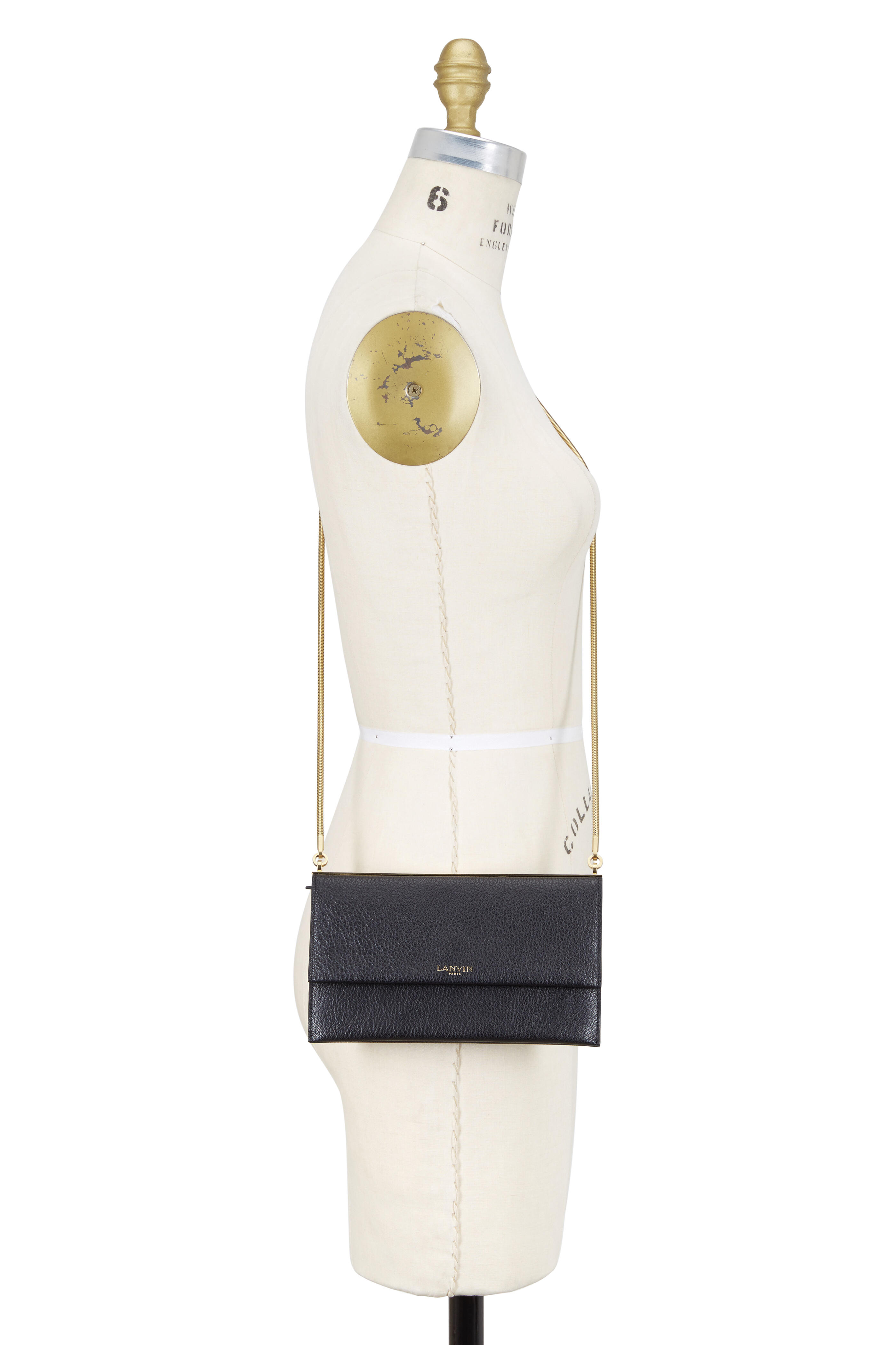 Goatskin capra pebbled leather. Flap front with magnetic snap closure. Snake chain shoulder strap. One interior zip and two open pockets, six card slots. Lined in calfskin suede. Made in Italy. Width: 8 ½". Height: 5". Depth: ½". Strap drop: 21".
