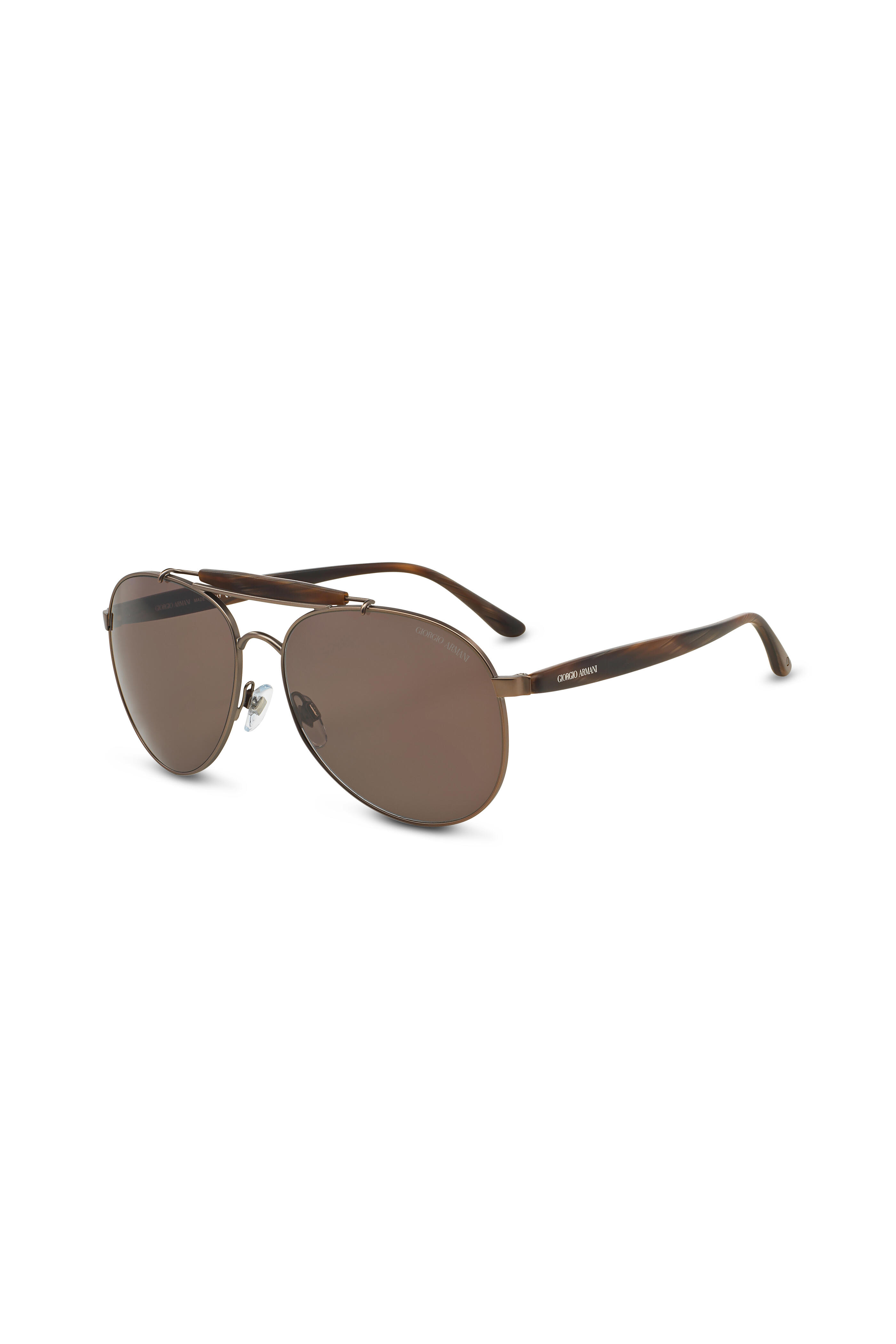Frame material: metal and matte horn. Frame color: matte bronze and brown. Lens color: dark brown. Lens shape: aviator. Lens treatment: 3N (high brightness). Logo detail on lens and temple. Made in Italy. Style: 0AR6022-300653. Lens width: 58 mm. Bridge width: 15 mm. Temple length: 145 mm.