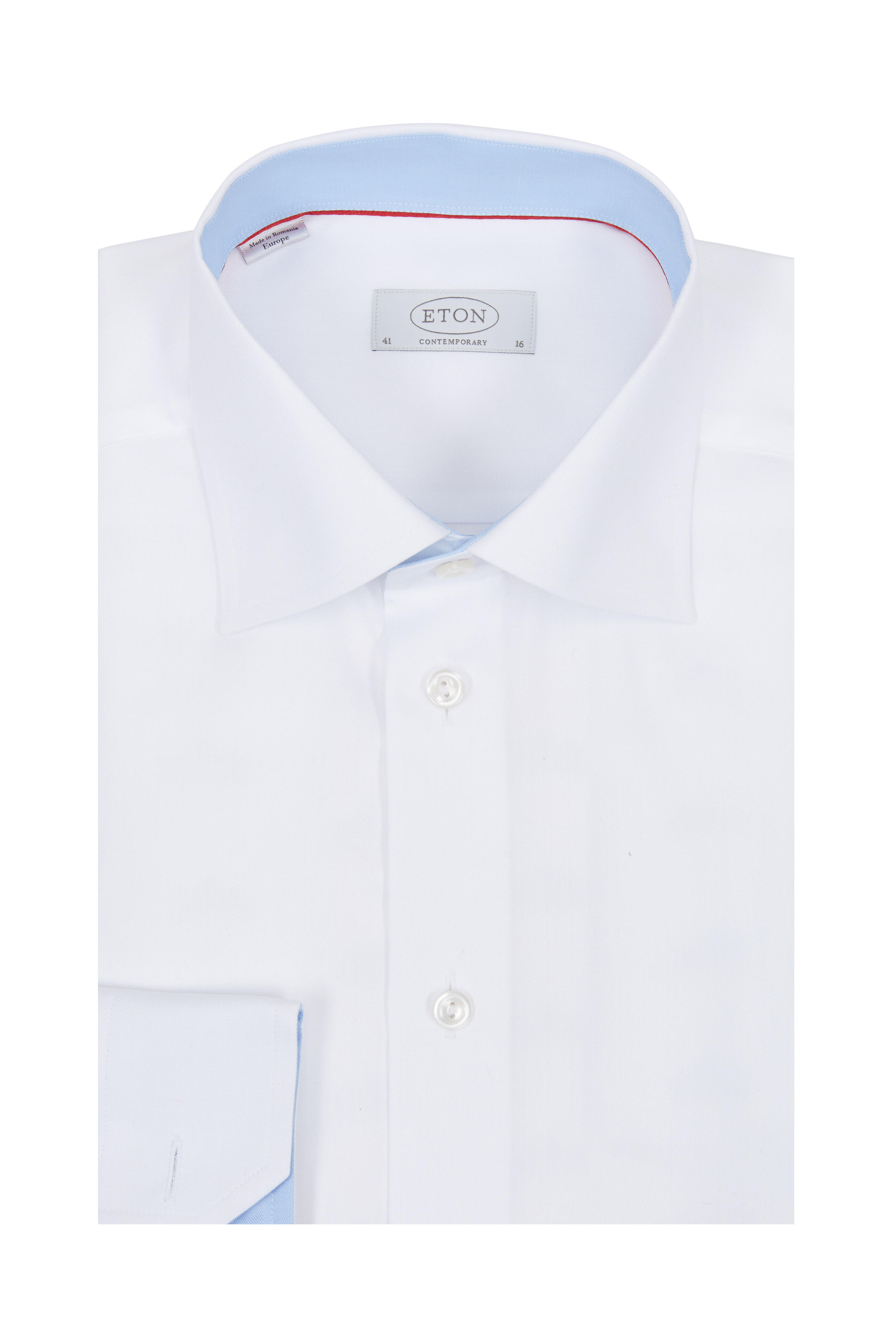 Spread collar. Single button mitered cuffs, contrast lining. Contemporary fit. 100% cotton. Machine wash.