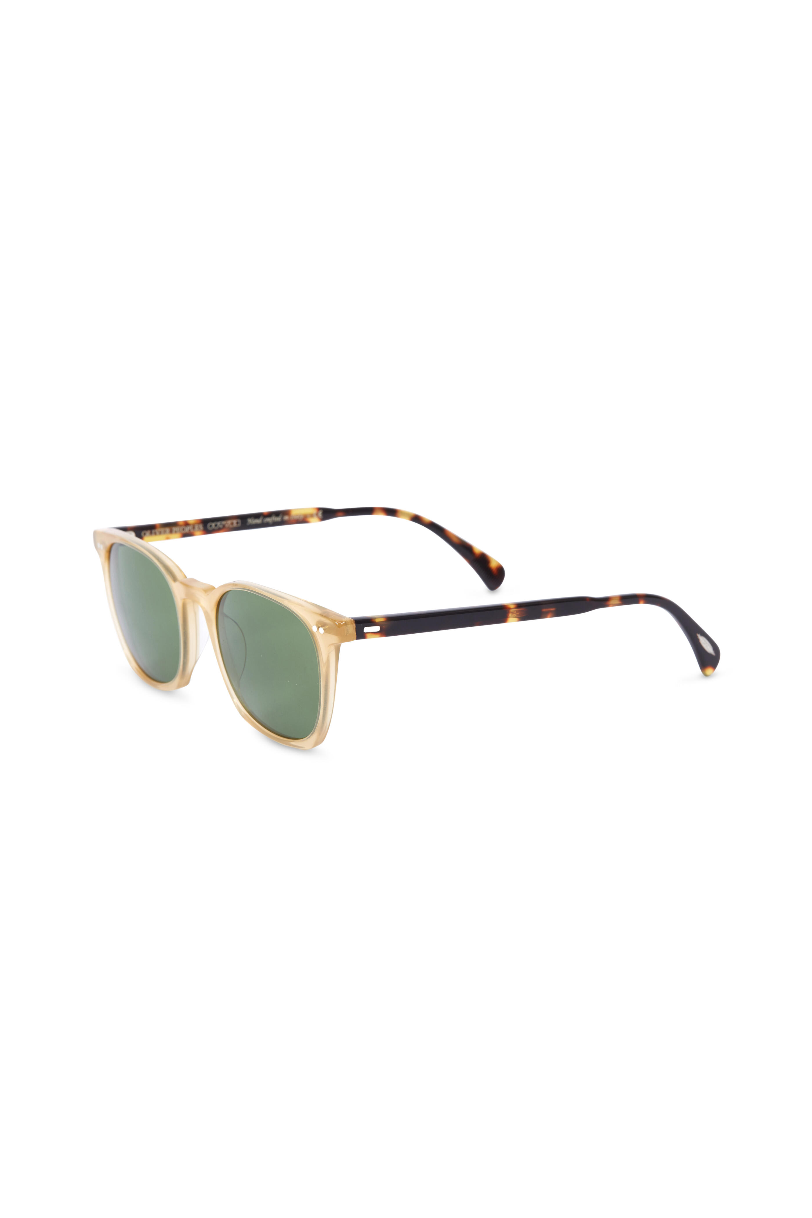 Frame material: acetate. Frame color: light beige with havana temples. Lens color: green. Lens treatment: 2N (medium brightness). Hand crafted in Italy. Style: OV5297SU-0349. Lens width: 49 mm. Bridge width: 20 mm. Temple length: 145 mm.