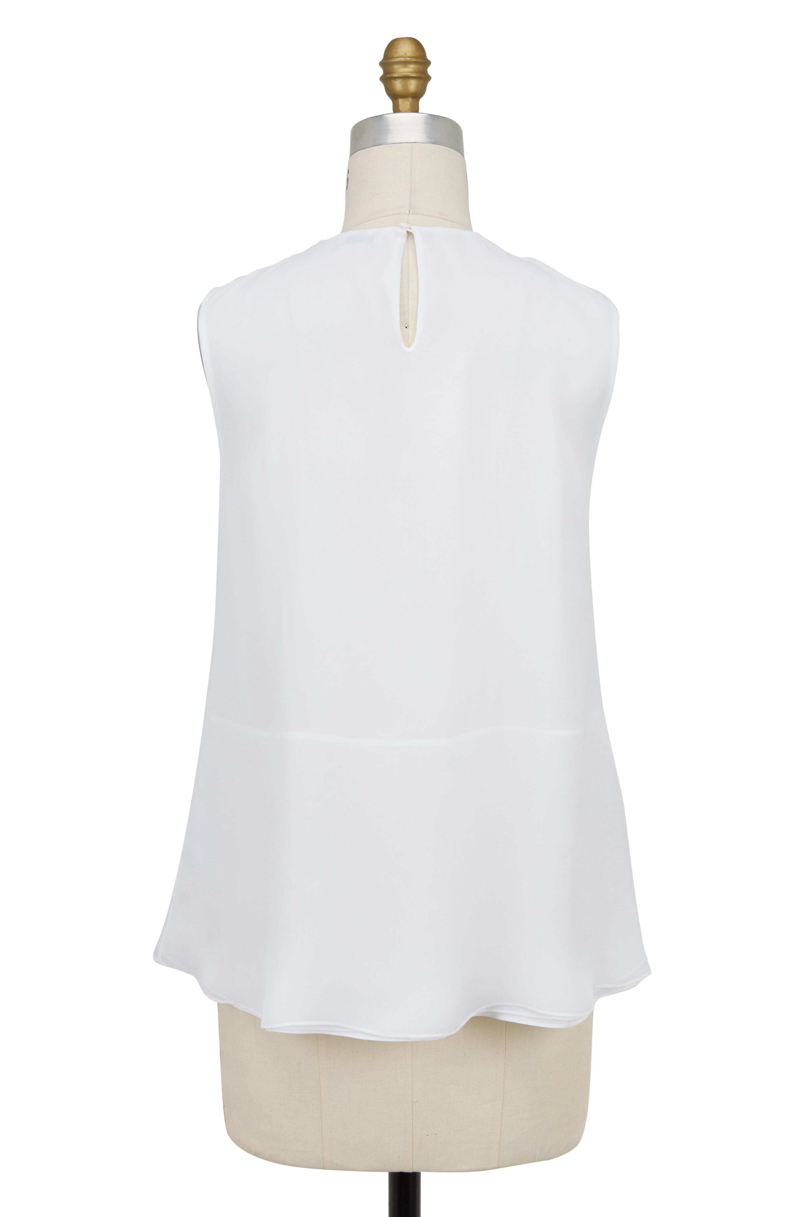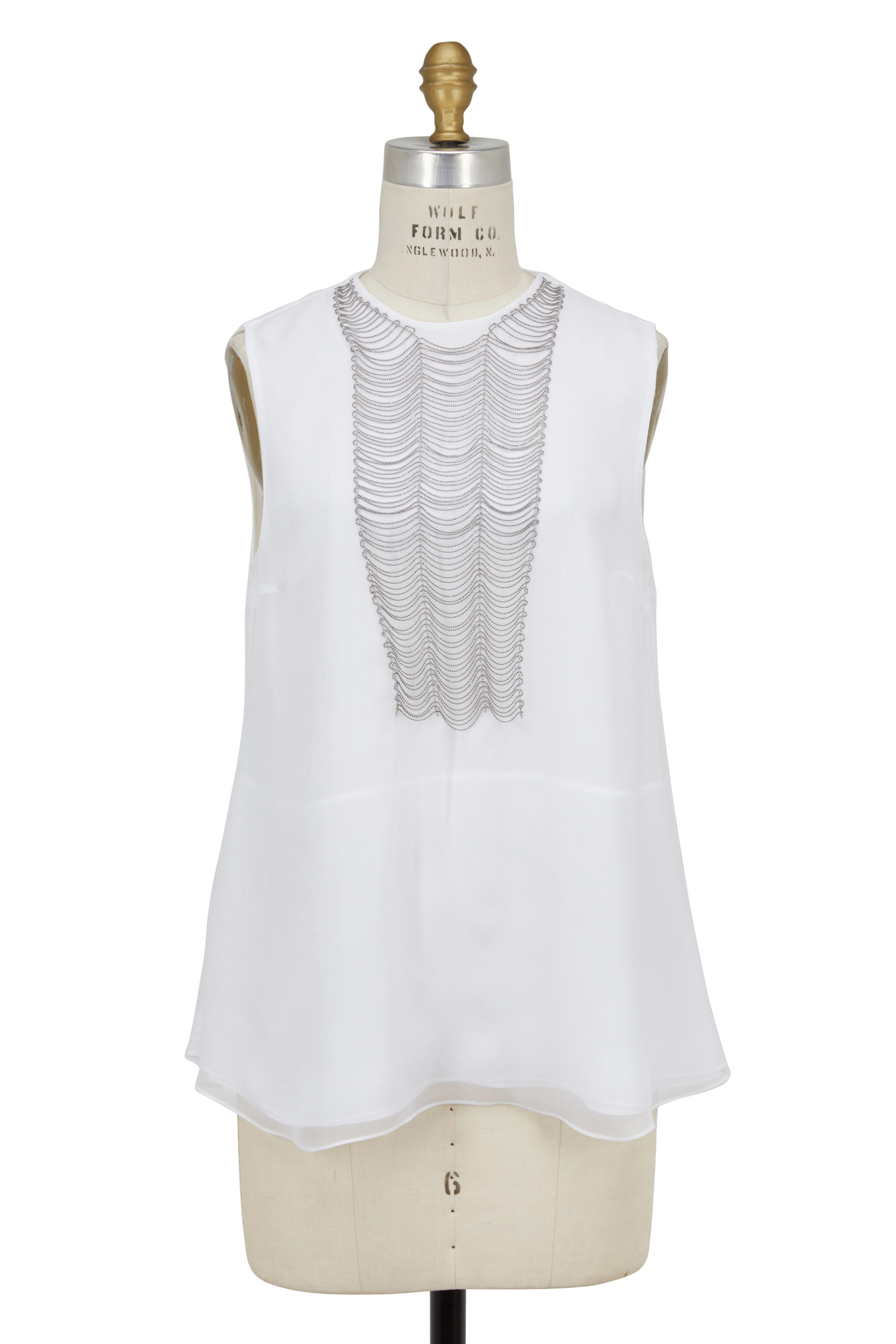 Round neckline. Button back closure with keyhole. Draped monili bib. Made in Italy. 100% silk. Dry clean.