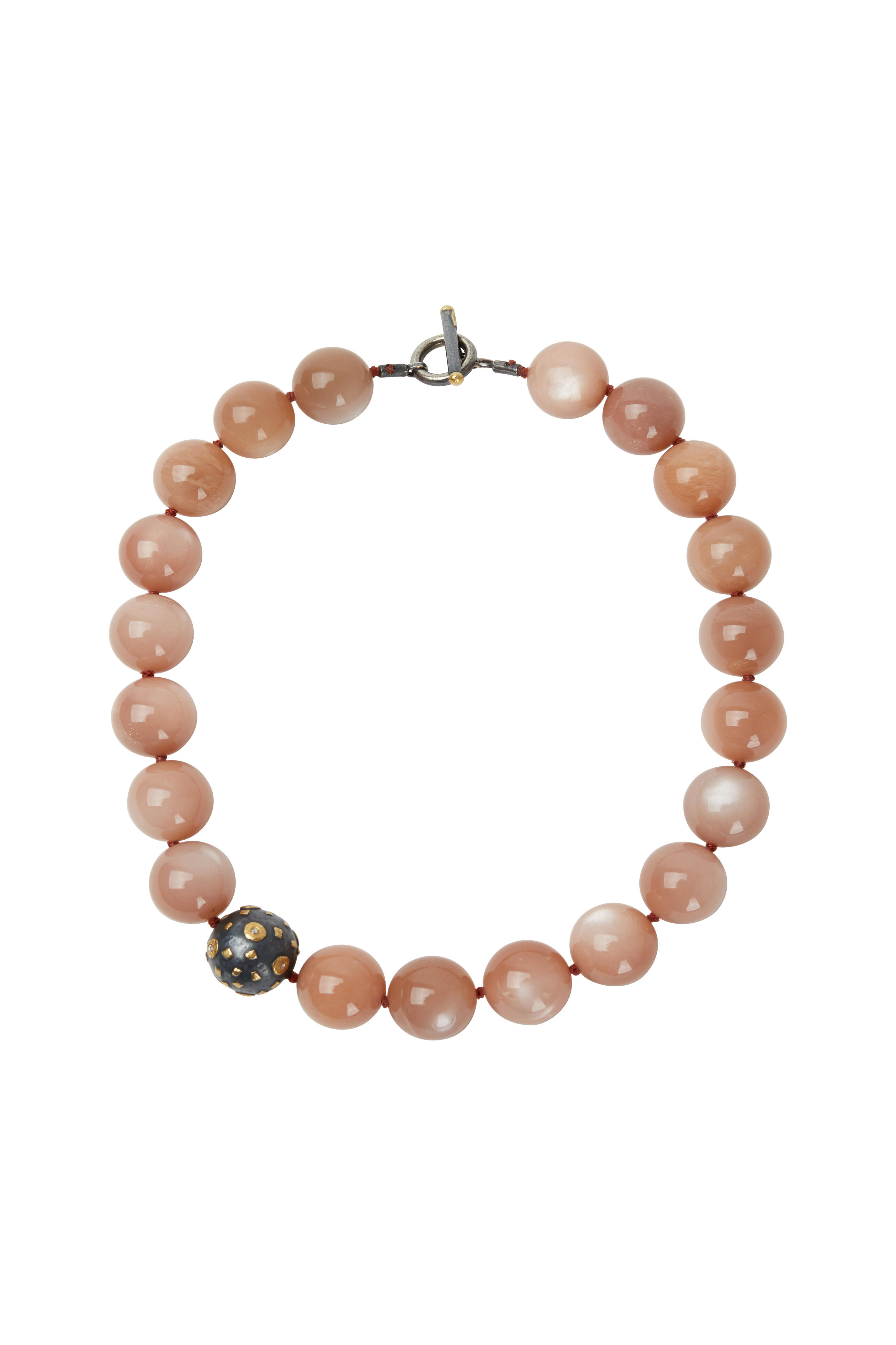 24k yellow gold. 18mm moonstones. Cognac diamonds. Toggle clasp.