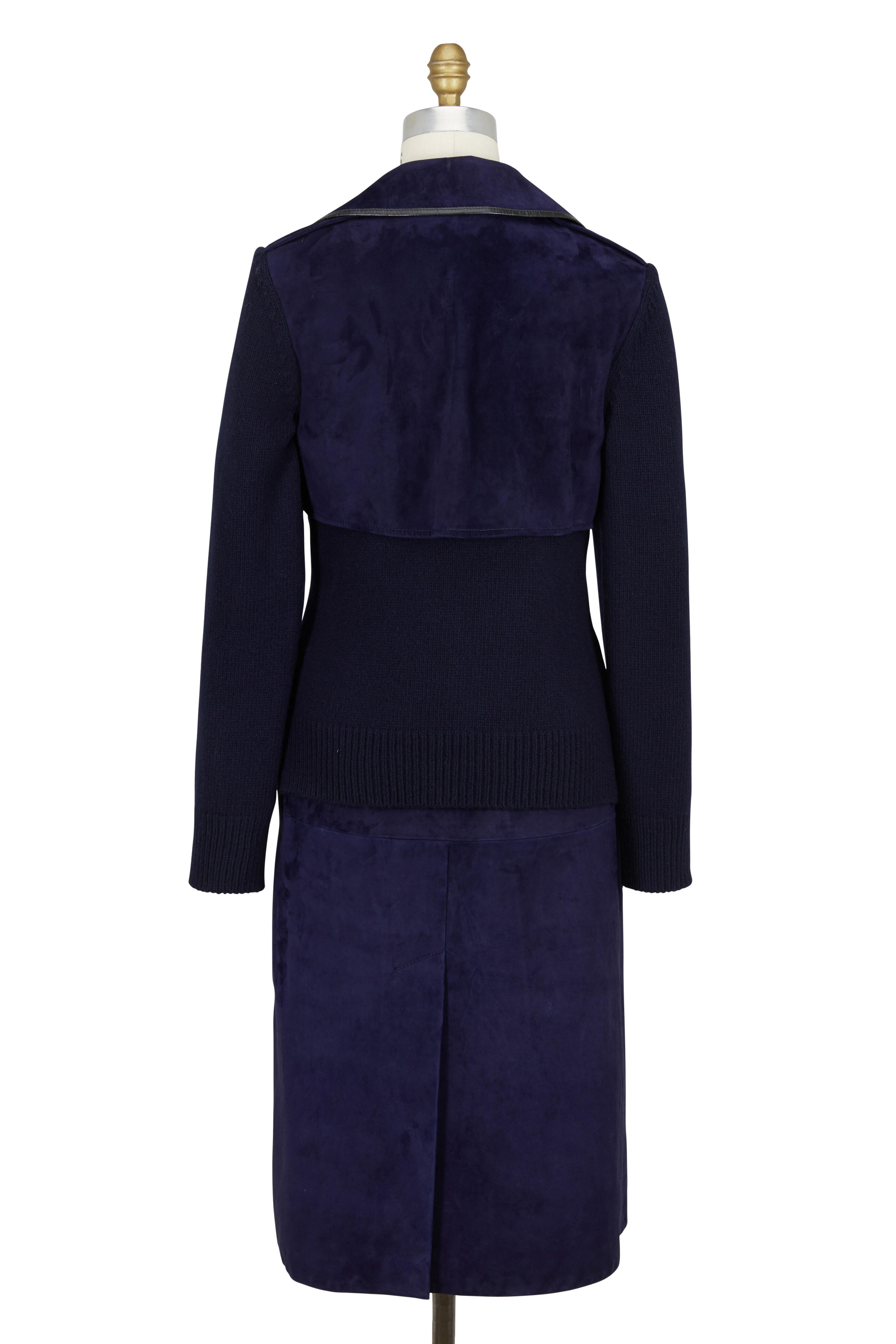 Specialist clean. Notched lapels. Attached self belt. Contrast knit sleeves and back panel. Side slash pockets. Vented back. Made in Italy. Length: 42". 100% calfskin suede; knit: 100% superfine wool, lining: 52% rayon, 48% cotton.