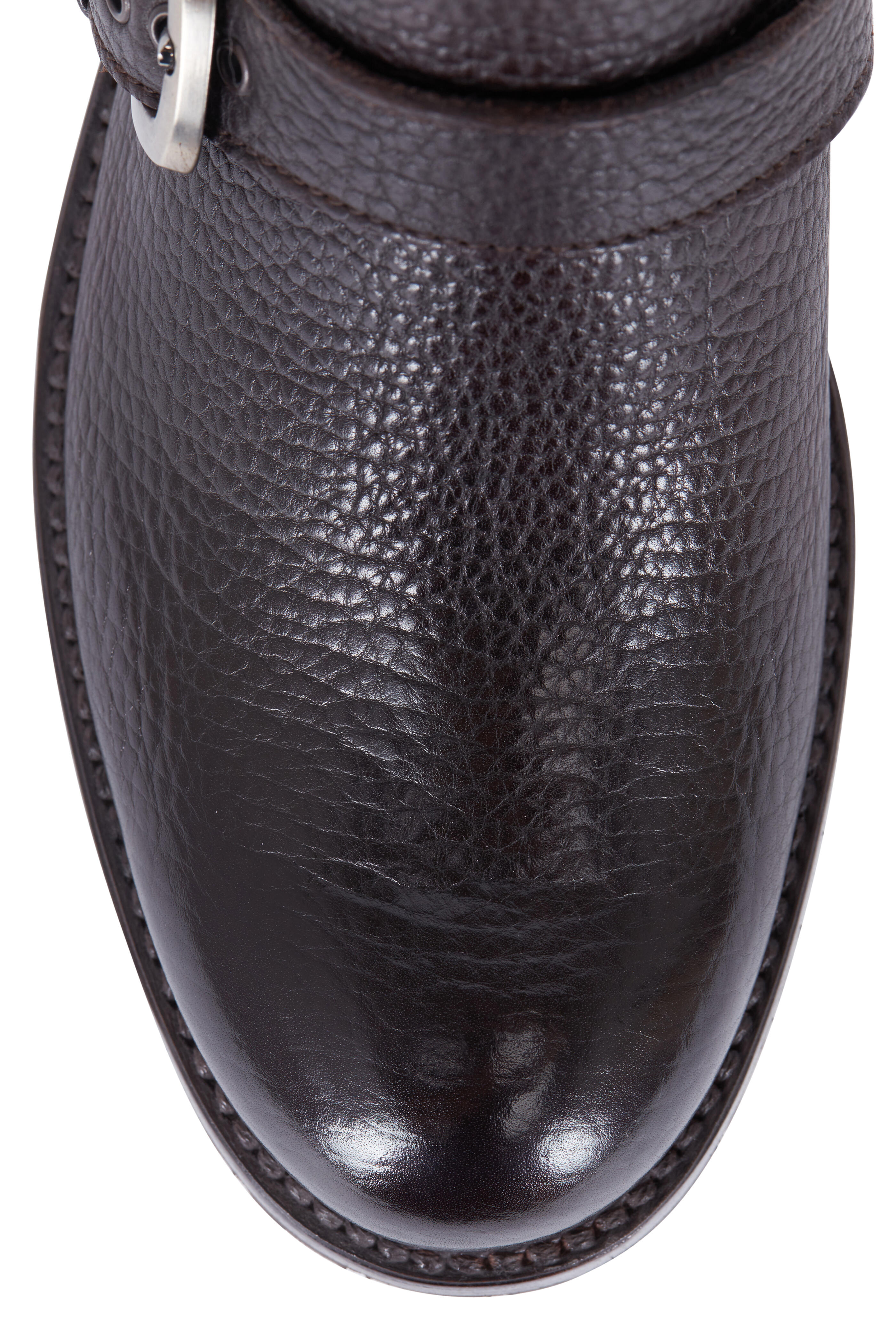 Brown Grained Leather Three Buckle Moto Ankle Boot