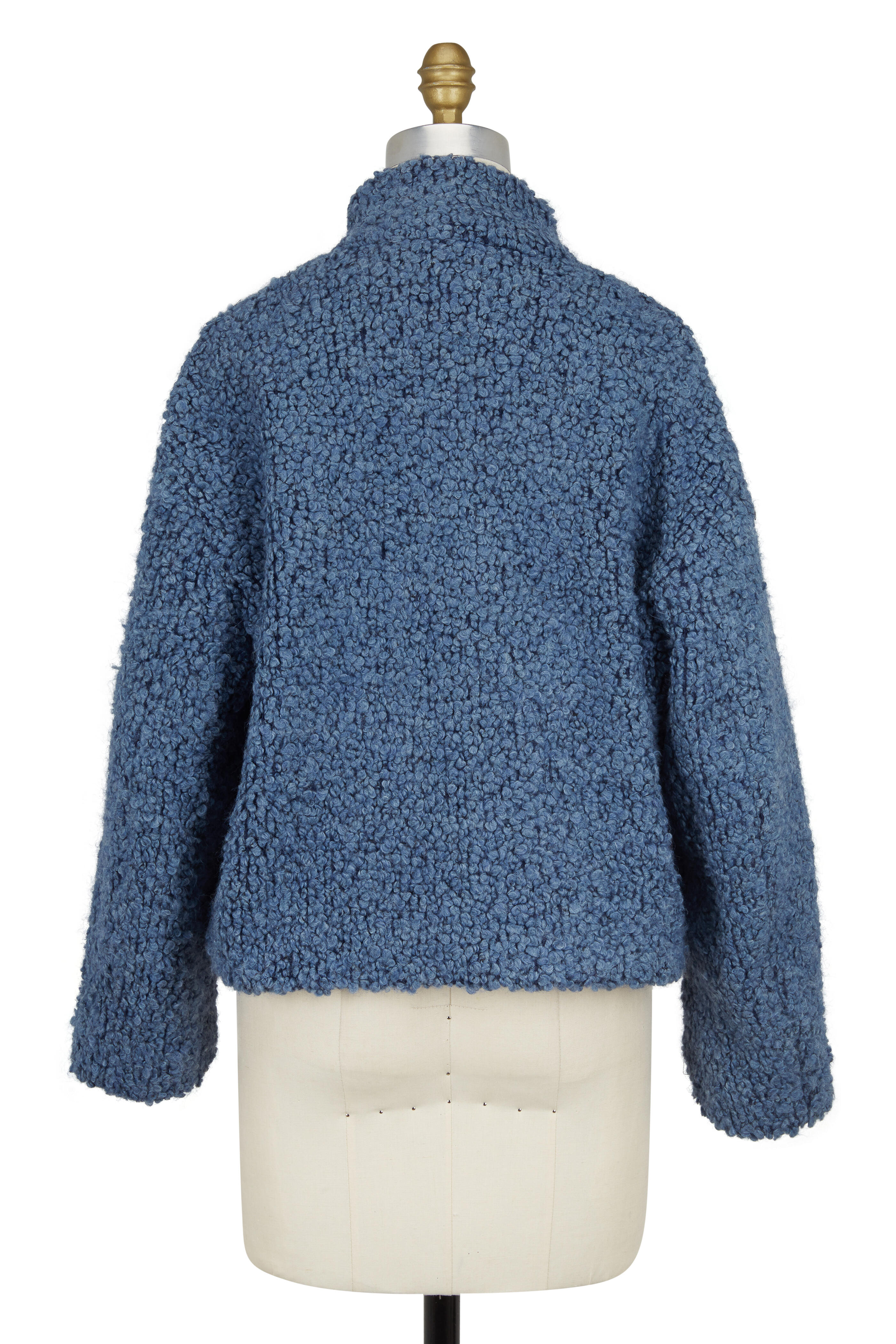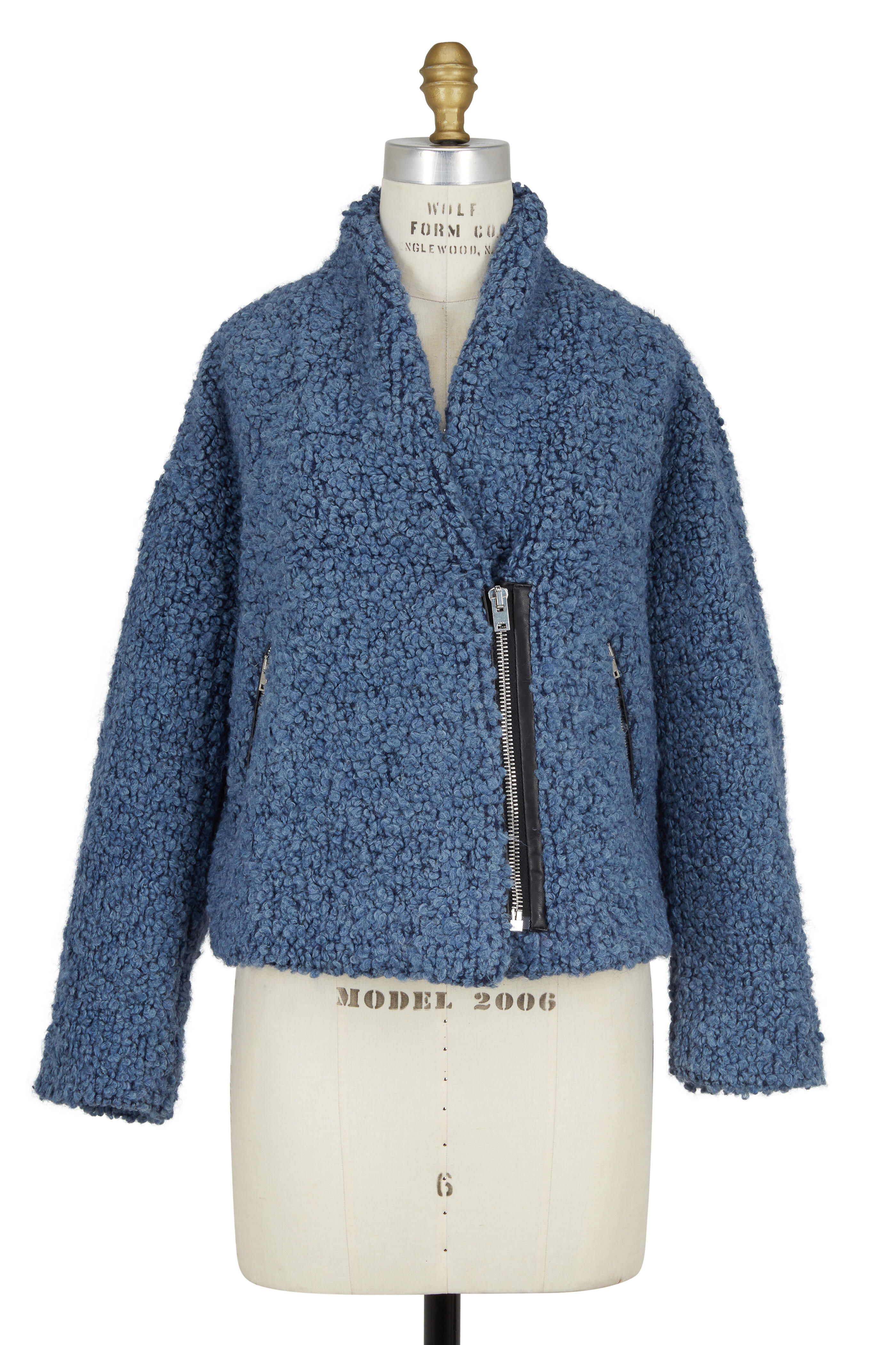 Surplice neckline. Off-center zip front. Side zipped slash pockets. Leather trim. Imported. Length: 18" (size 4). 40% cotton, 27% acrylic, 10% wool, 20% polyester, 3% other fibers; trim: 100% lambskin leather; fully lined. Dry clean.