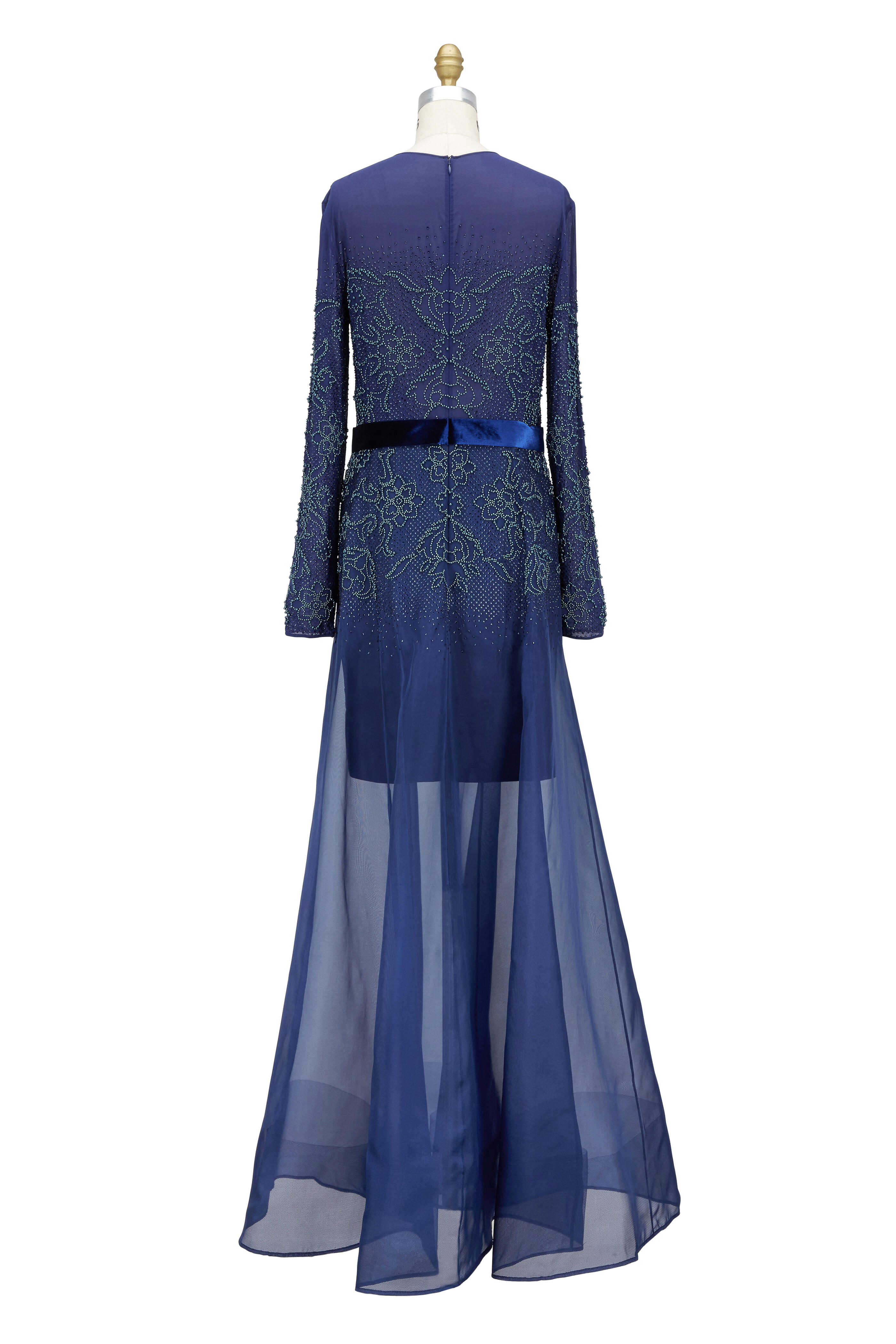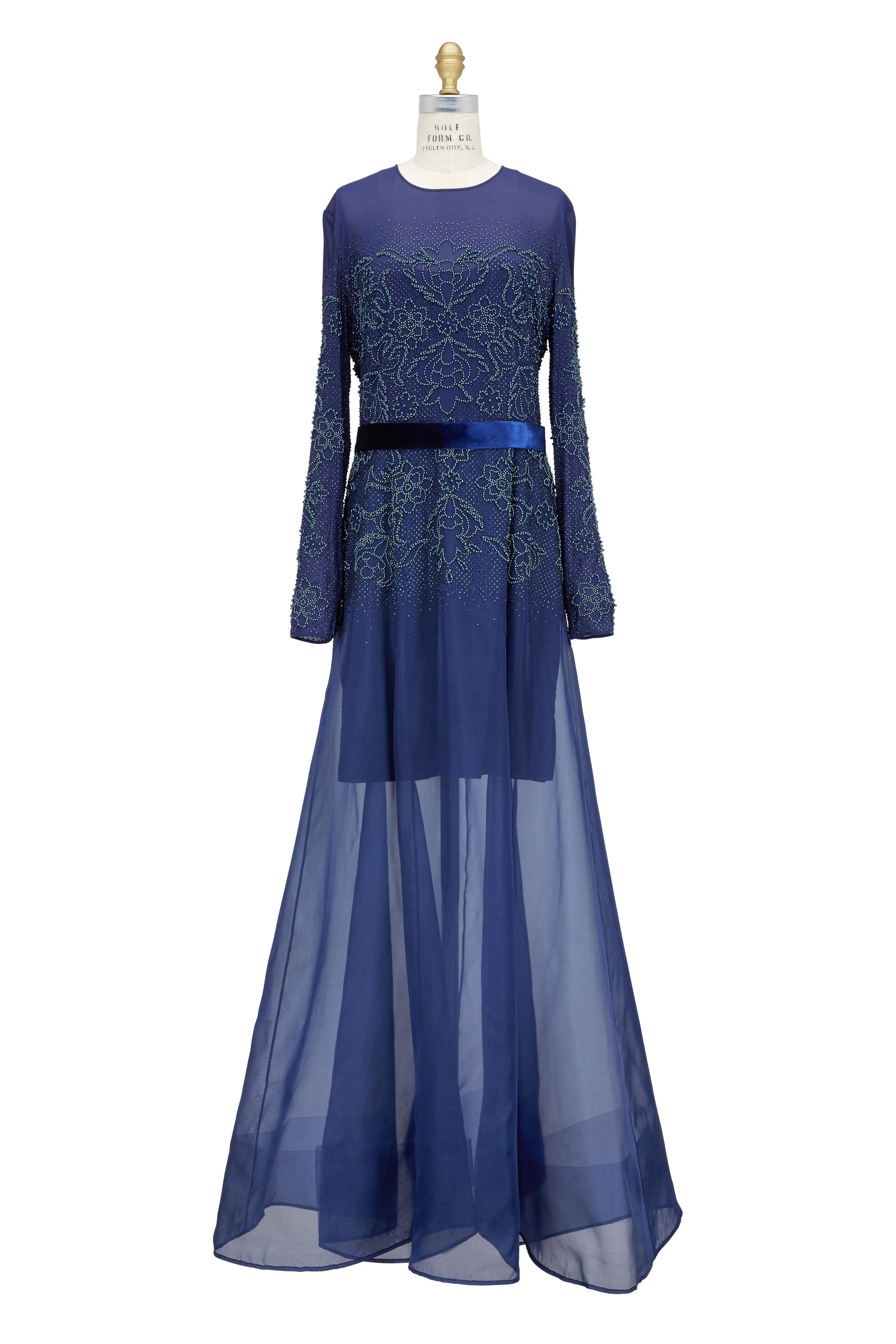 Specialist clean. Round neckline. Concealed back zip closure. Banded velvet waistband. Organza skirt. Flowy hem. Imported. 92% silk, 8% spandex; skirt: 100% silk; fully lined.
