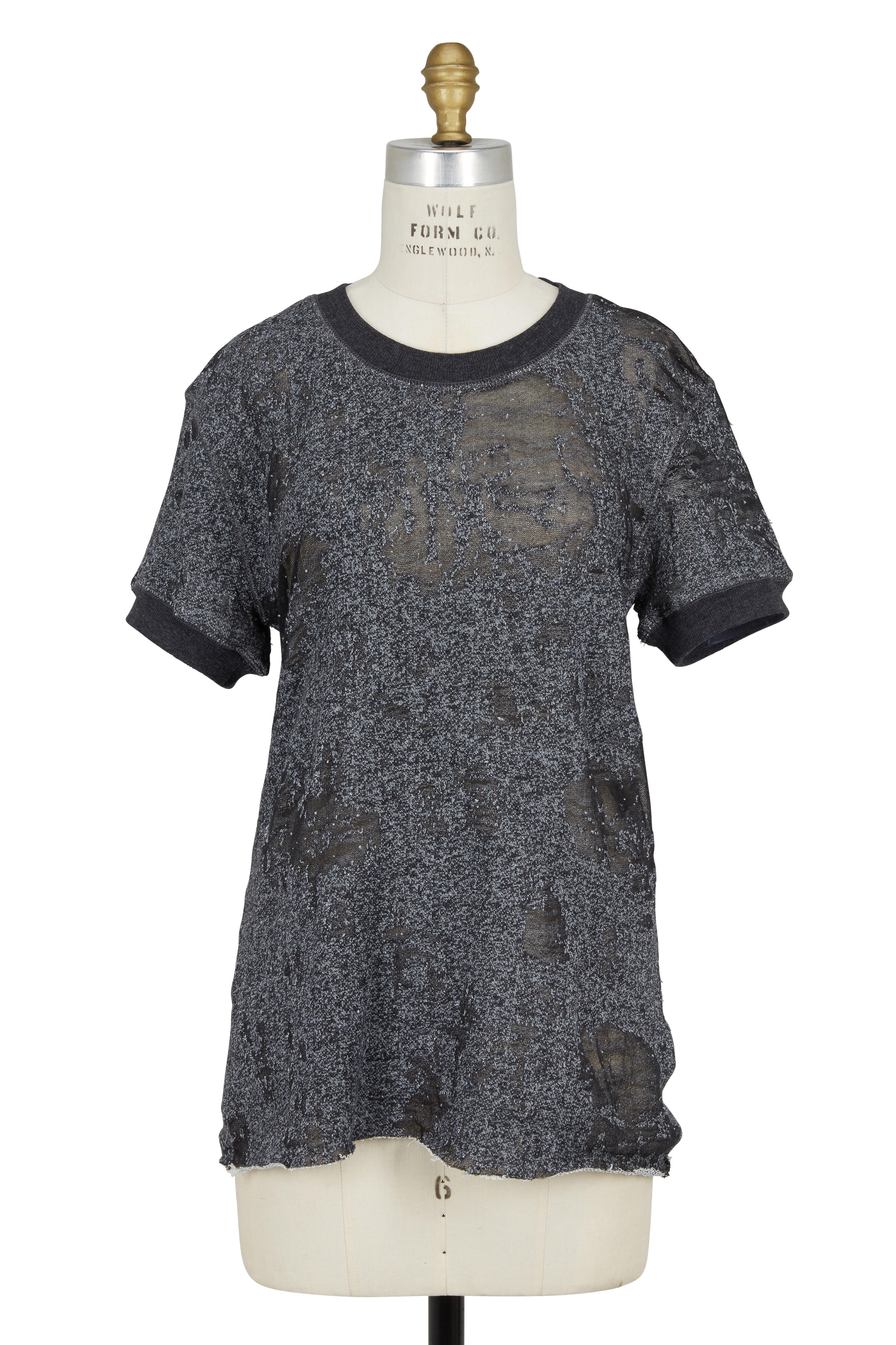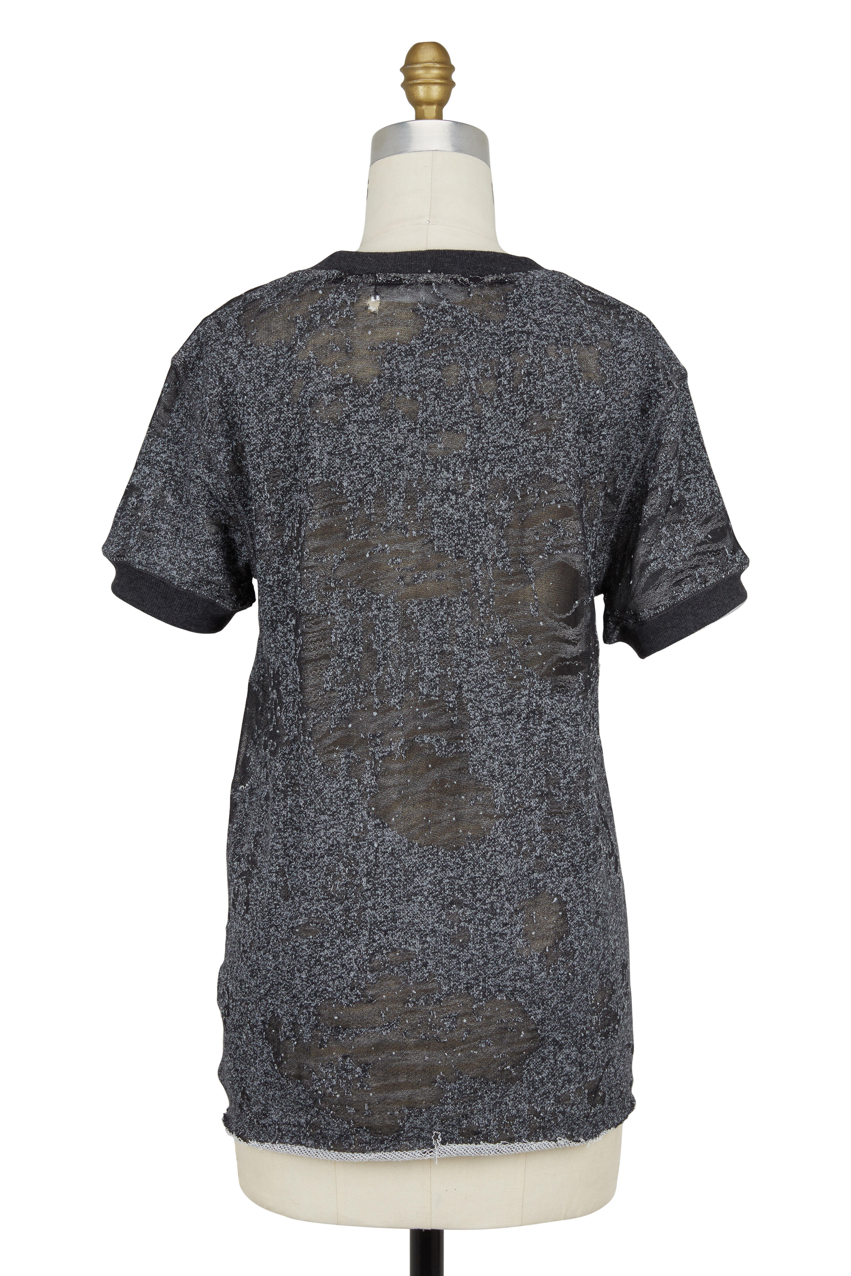 Crewneck. Raw hem. Banded trim at collar and sleeves. Imported. Semi-sheer. 54% cotton, 36% polyester, 10% rayon. Hand wash.