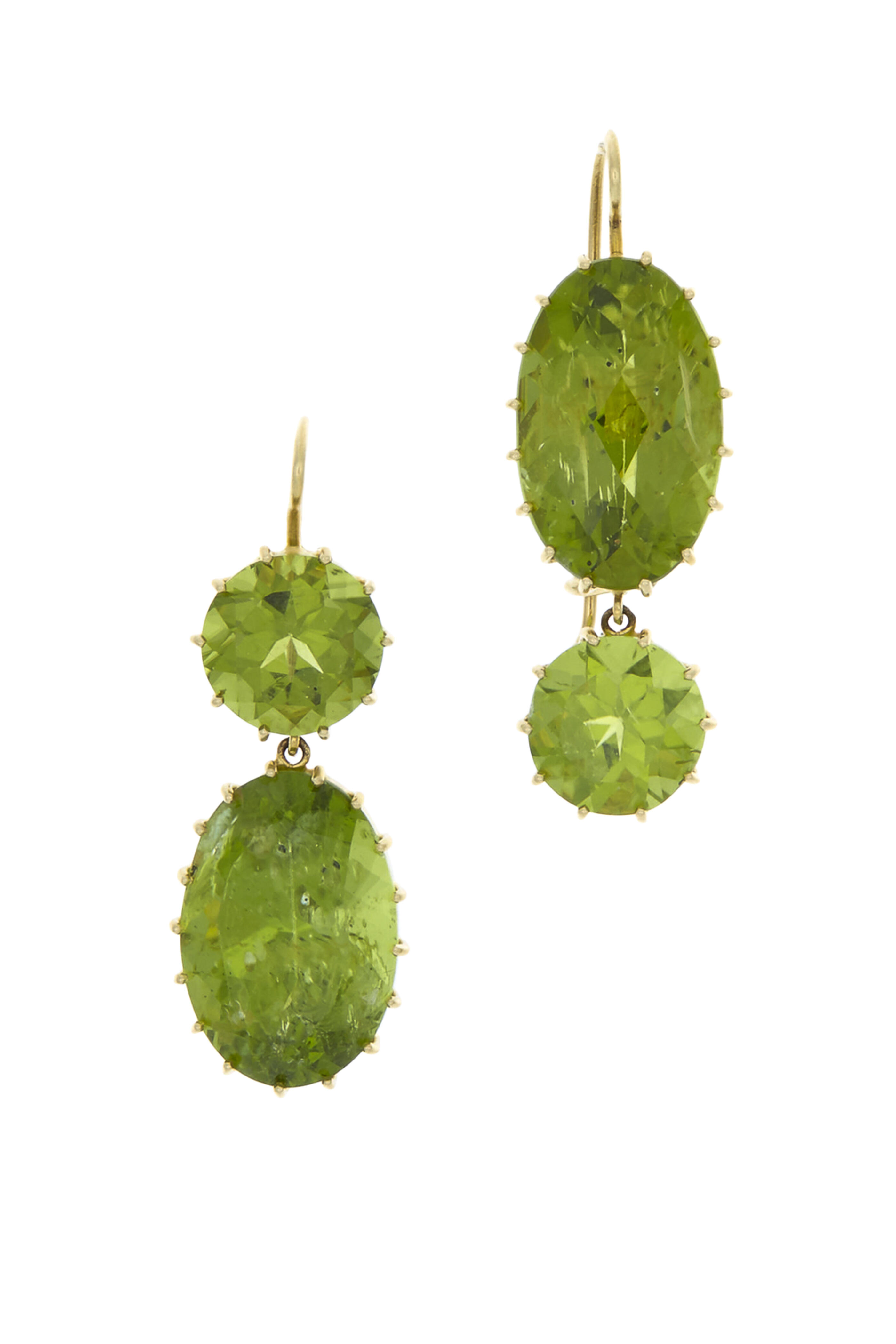 18k yellow gold. Peridot gemstones with natural inclusions. 2 point earrings. French wire backs.