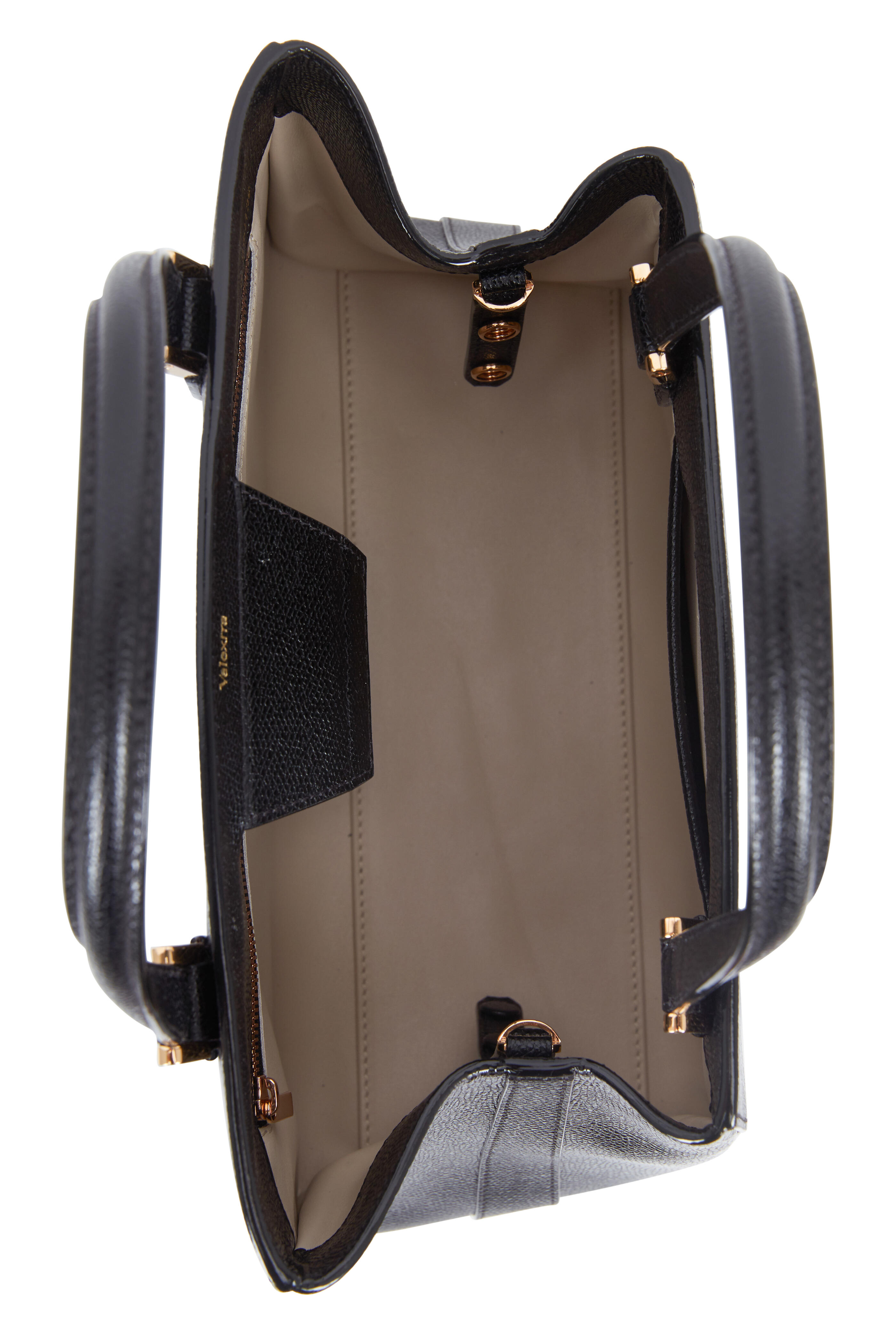 Leather. Dual flat top handles. Detachable flat shoulder strap. Asymmetric top line. Center snap-button tab closure. One interior zip and one open pocket. Lined in leather. Protective metal feet. Made in Italy. Width: 11". Height: 9". Depth: 5". Handle drop: 4 ½". Strap drop: 16".